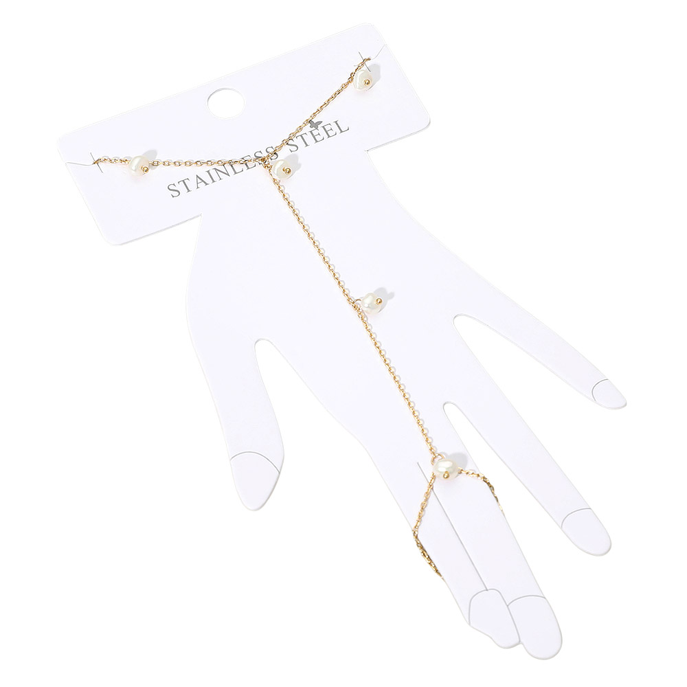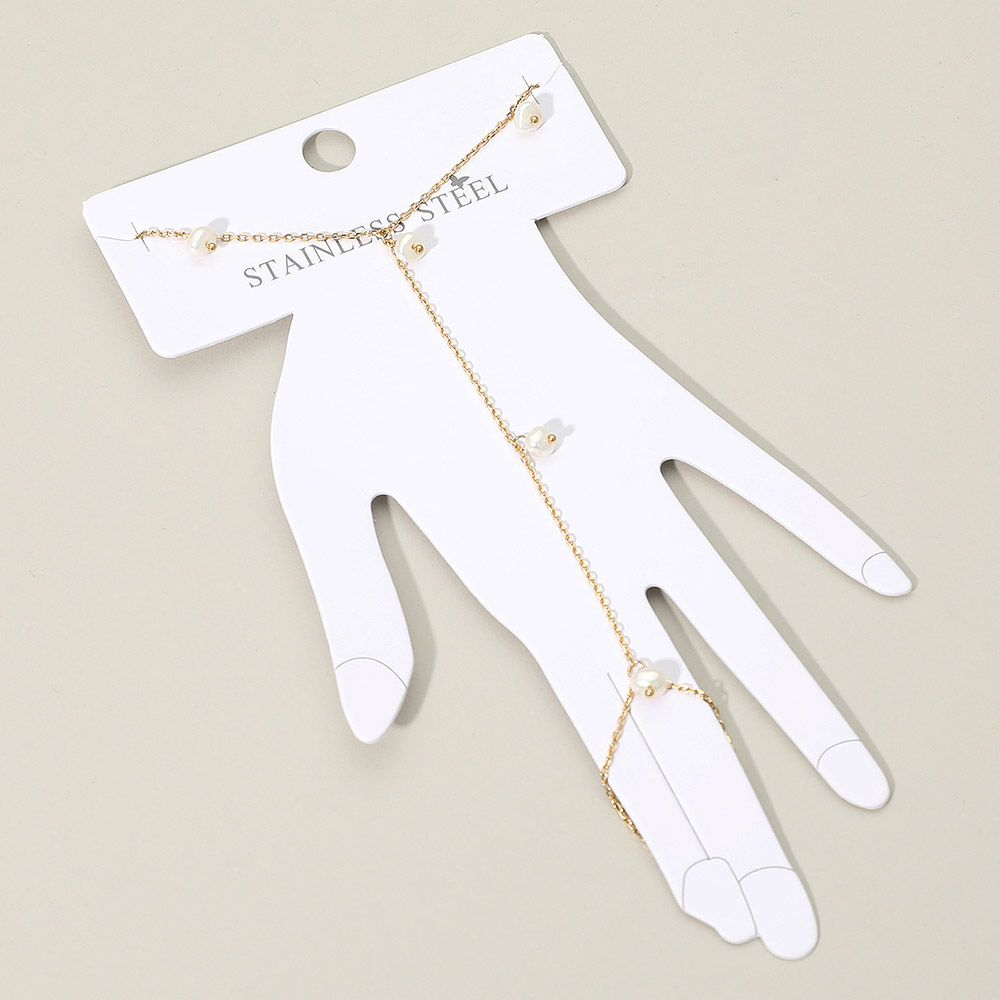 Details • Size : 3.5" H, 6.5" + 1" L • Ring Size : Free • Delicate hand chain bracelet featuring a slim linked design with subtle pearl bead accents and a graceful ring-to-wrist connection. Adds a refined touch to casual or dressy looks, offering lightweight comfort and stylish detail suitable for everyday wear or special occasions. • Stainless Steel