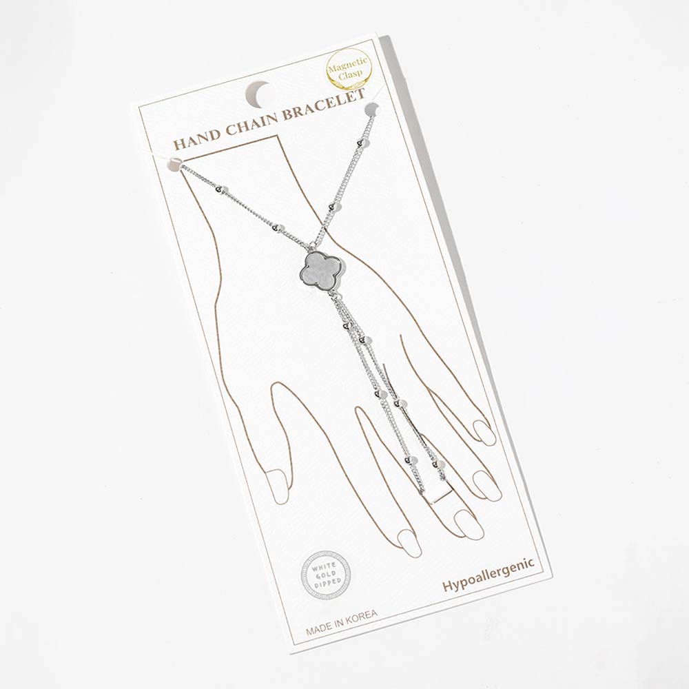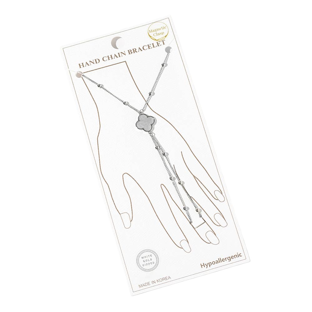 Details • Size : 0.8" H, 7" + 0.25" L • Ring Size : Free • Magnetic Clasp Closure • This stylish hand chain bracelet features a refined clover quatrefoil creates an elegant layered look. Finished with an easy magnetic clasp for comfortable wear, it adds a chic statement to everyday outfits, special occasions, and curated boutique jewelry collections. Designed to stand out while remaining versatile and wearable. • Gold Dipped • Hypoallergenic • Lead and Nickel Compliant • Made In Korea