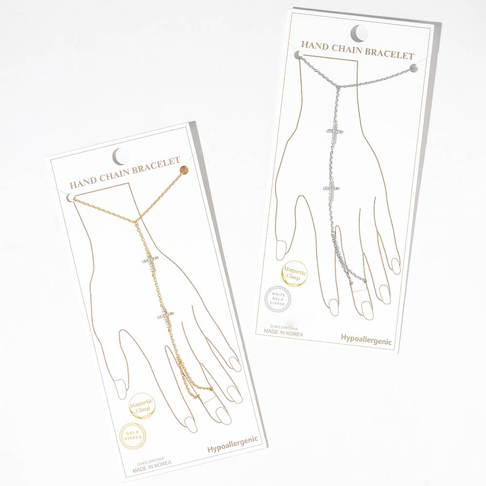 Details • Size : 3.25" H, 7" + 0.25" L • Ring Size : Free • Magnetic Clasp Closure • This elegant hand chain bracelet features a refined cross accent with a connected wrist-to-finger design for a modern, graceful statement. Designed with a convenient magnetic clasp for easy wear, it delivers a sleek layered look that elevates everyday outfits, evening styles, and boutique jewelry collections. Ideal for customers seeking meaningful yet fashion-forward hand jewelry. • CZ Cubic Zirconia • Gold Dipped • Hypoallergenic • Lead and Nickel Compliant • Made In Korea