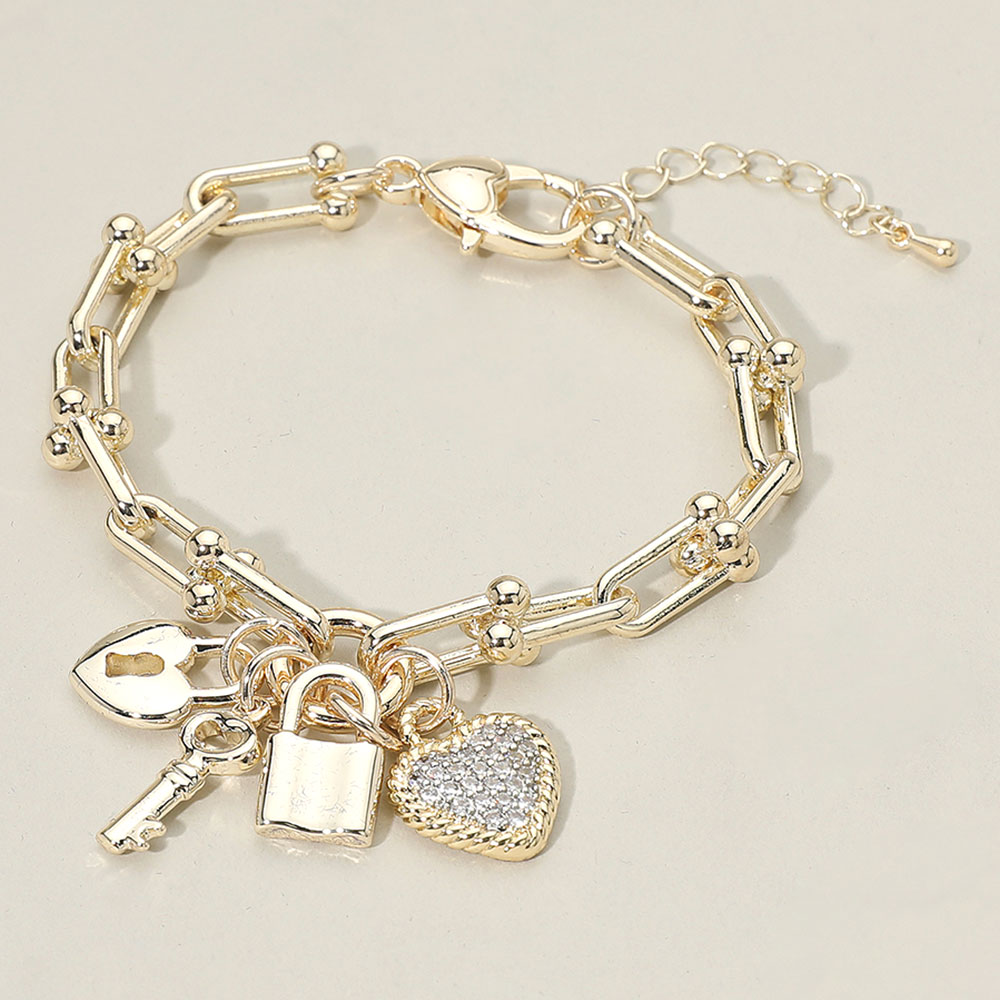 • Adjustable charm bracelet featuring a stylish link chain adorned with padlock, key, heart and tag charms. Designed for everyday wear, this accessory adds a playful touch to any outfit and makes a great gift. Lightweight, eye-catching and perfect for stacking or wearing solo.