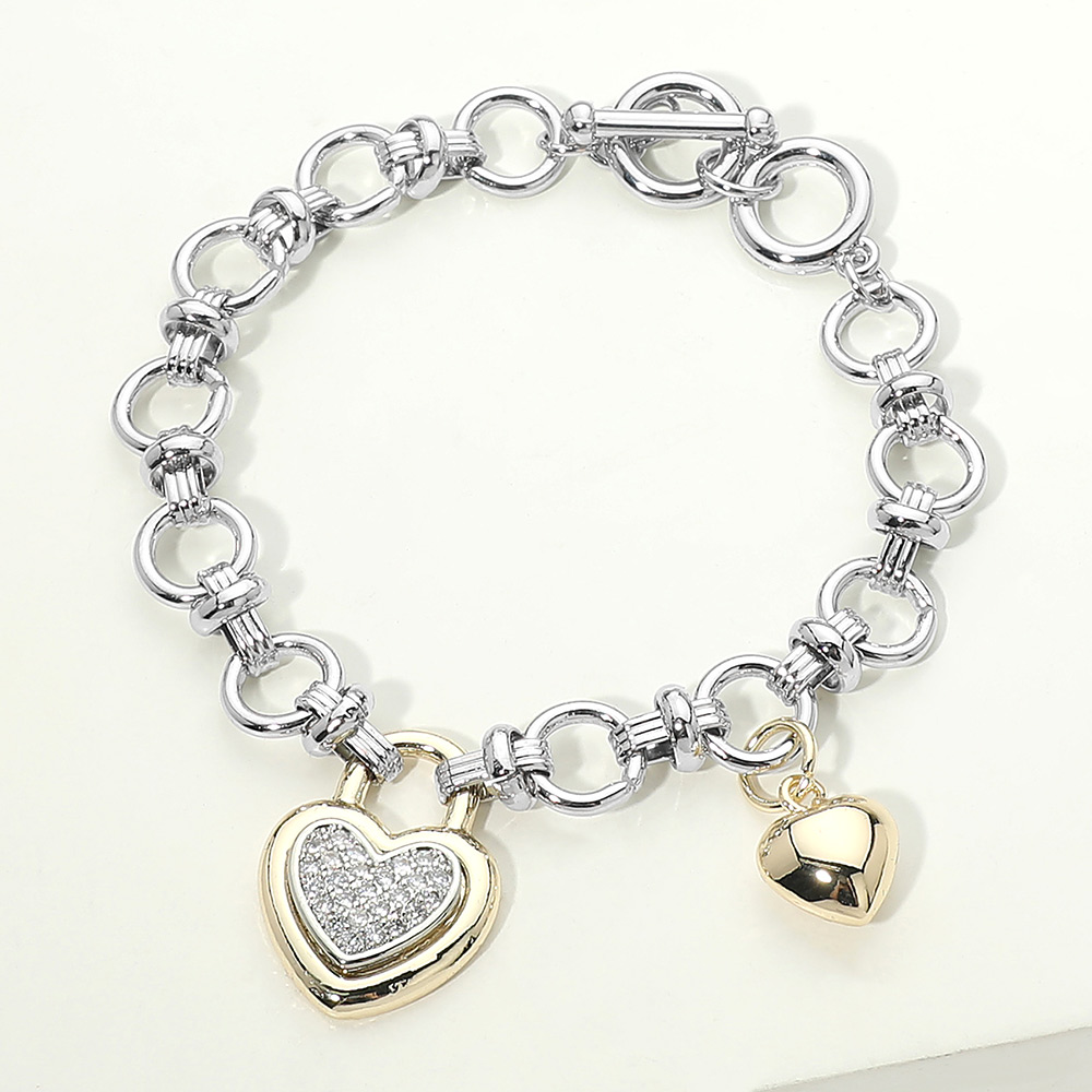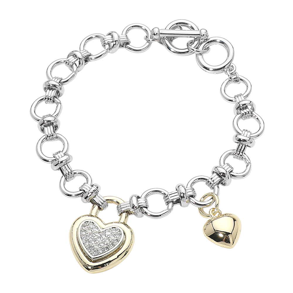 14K Gold Plated Two Tone CZ Pave Heart Charm Link Toggle Bracelet