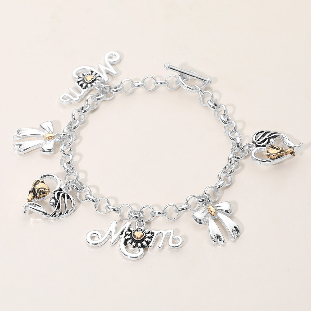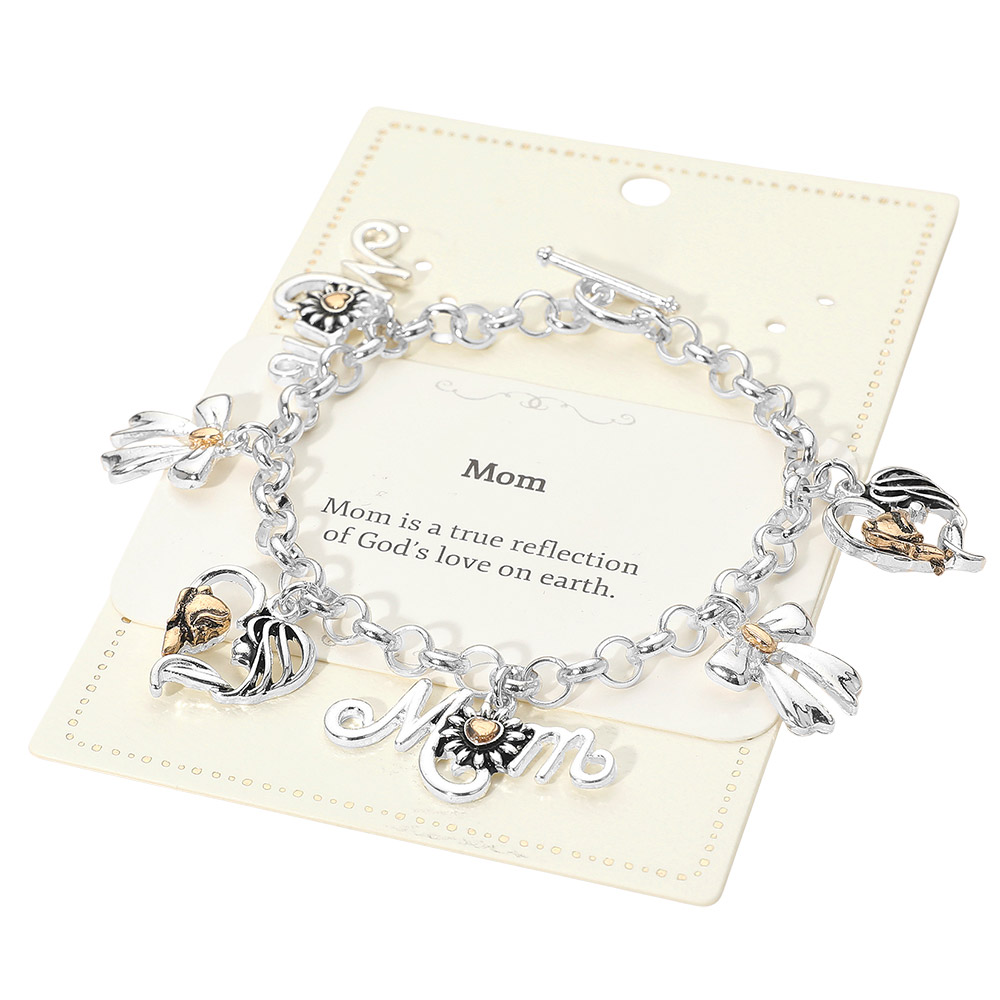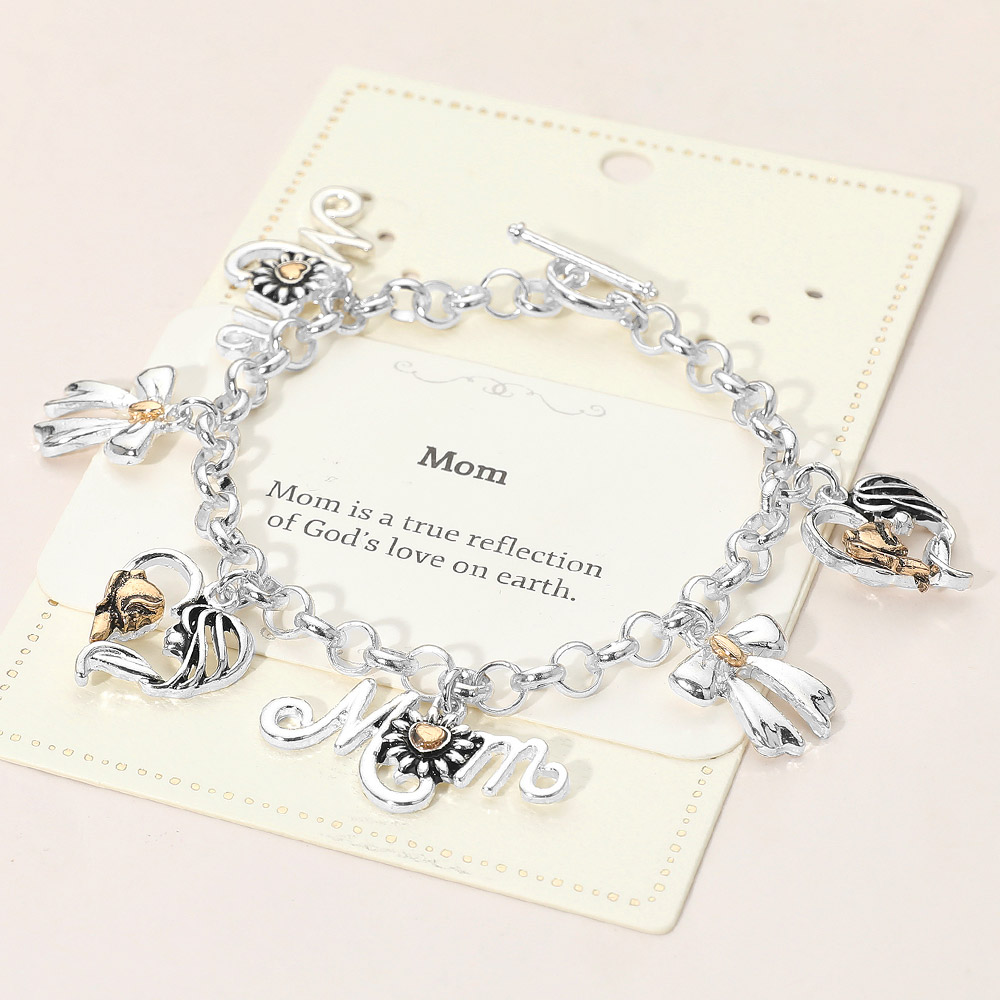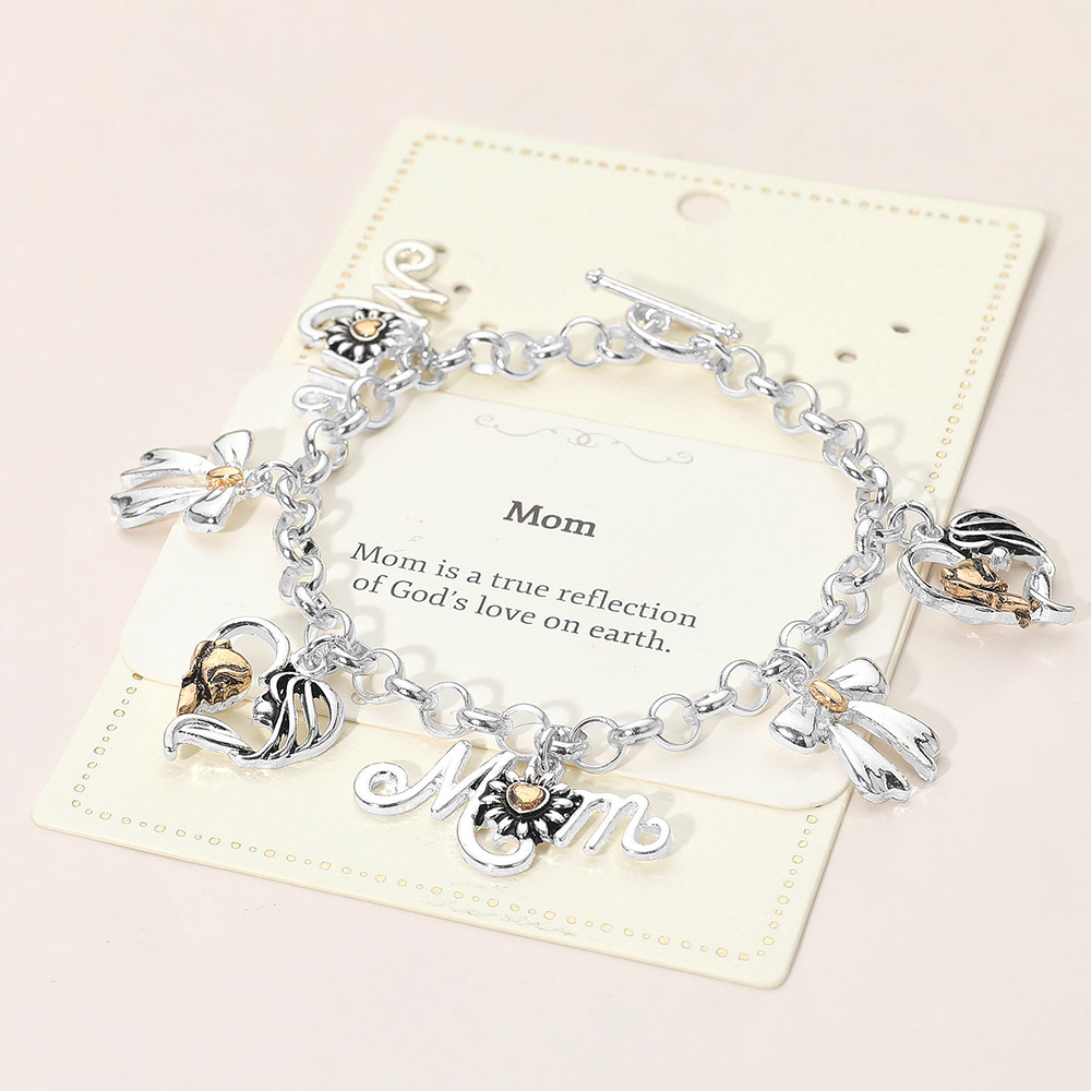 Details • Size : 1.2" H, 8" L • Toggle Closure • Meaningful mom charm link bracelet featuring sweet symbolic accents on a classic chain design. Created to celebrate love and appreciation, this bracelet offers an adjustable fit and effortless style, perfect for everyday wear or as a heartfelt gift for birthdays, Mother’s Day, or special moments. • Lead and Nickel Compliant