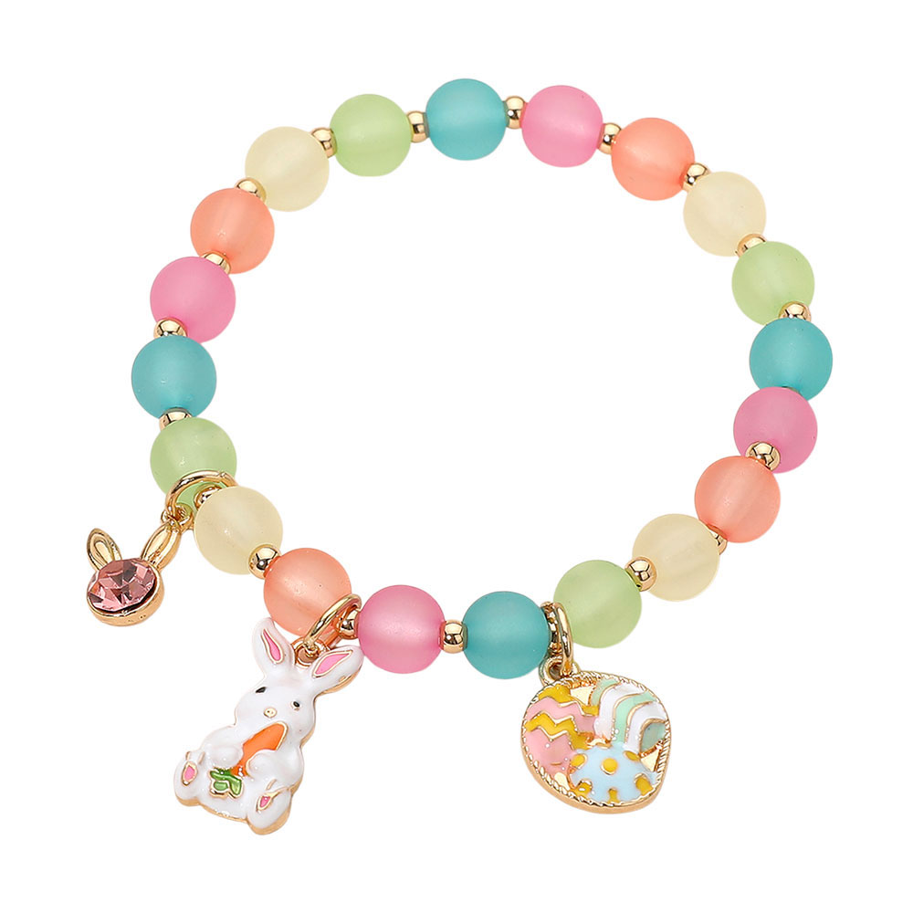 Details • Size : 0.3" H • Charm Size : 0.8" L • Stretchable • Playful beaded charm bracelet featuring cute bunny and egg charms for a fun, festive look. Designed for easy everyday wear, gifting, and seasonal displays. A cheerful accessory that adds charm and personality to outfits, parties, and holiday-themed collections. • Lead and Nickel Compliant