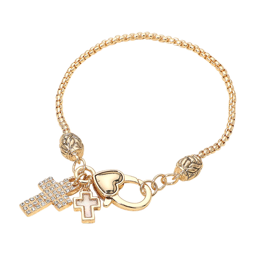 Details • Size : 0.5" H, 7.25" + 0.5" L • Charm Size : 1.1" L • Lobster Clasp Closure • Add a touch of elegance with this stylish bracelet featuring sparkling cross charms and a heart accent. Perfect for layering or wearing alone, this versatile accessory makes a meaningful gift or a chic addition to any jewelry collection. • Lead and Nickel Compliant