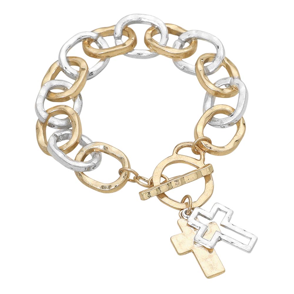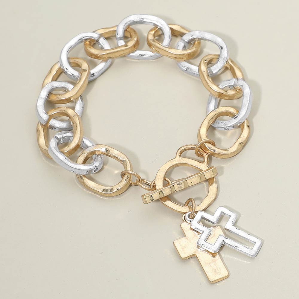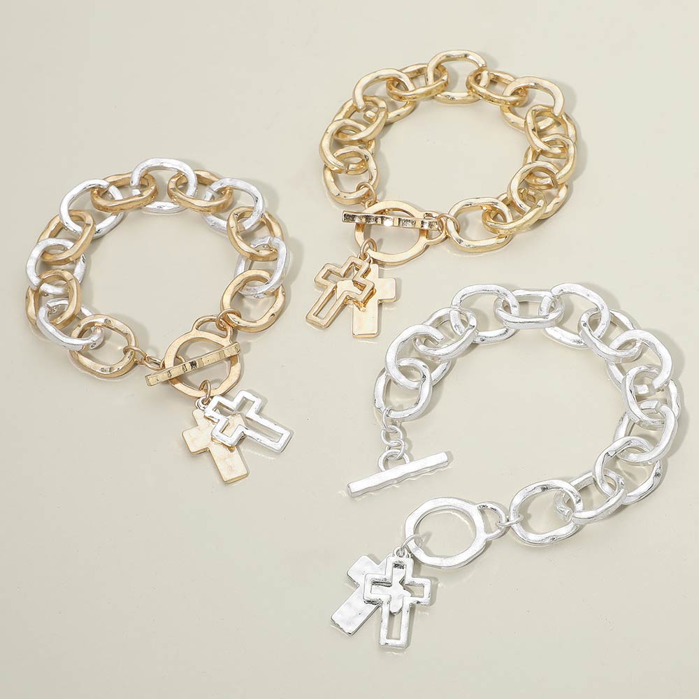 Details • Size : 0.6" H, 8" + 1" L • Charm Size : 1.1" L • Toggle Closure • Statement chain bracelet designed with bold rounded links and a secure toggle closure, finished with layered cross charms for added meaning and style. This bracelet delivers a strong yet refined look, perfect for everyday wear or stacking, offering timeless appeal, symbolic detail, and eye-catching dimension for modern jewelry collections. • Lead and Nickel Compliant