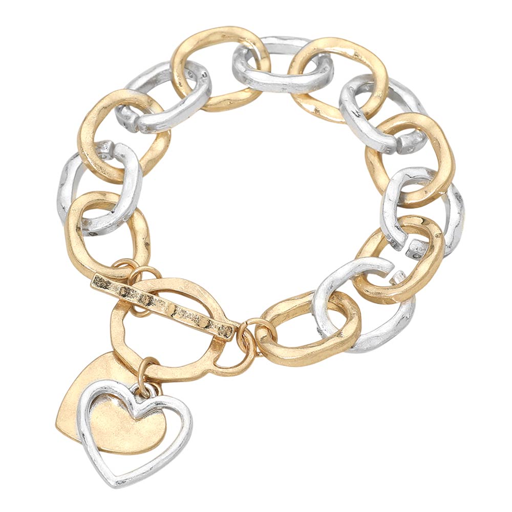 Hammered Layered Heart Charm Chunky Chain Toggle Bracelet