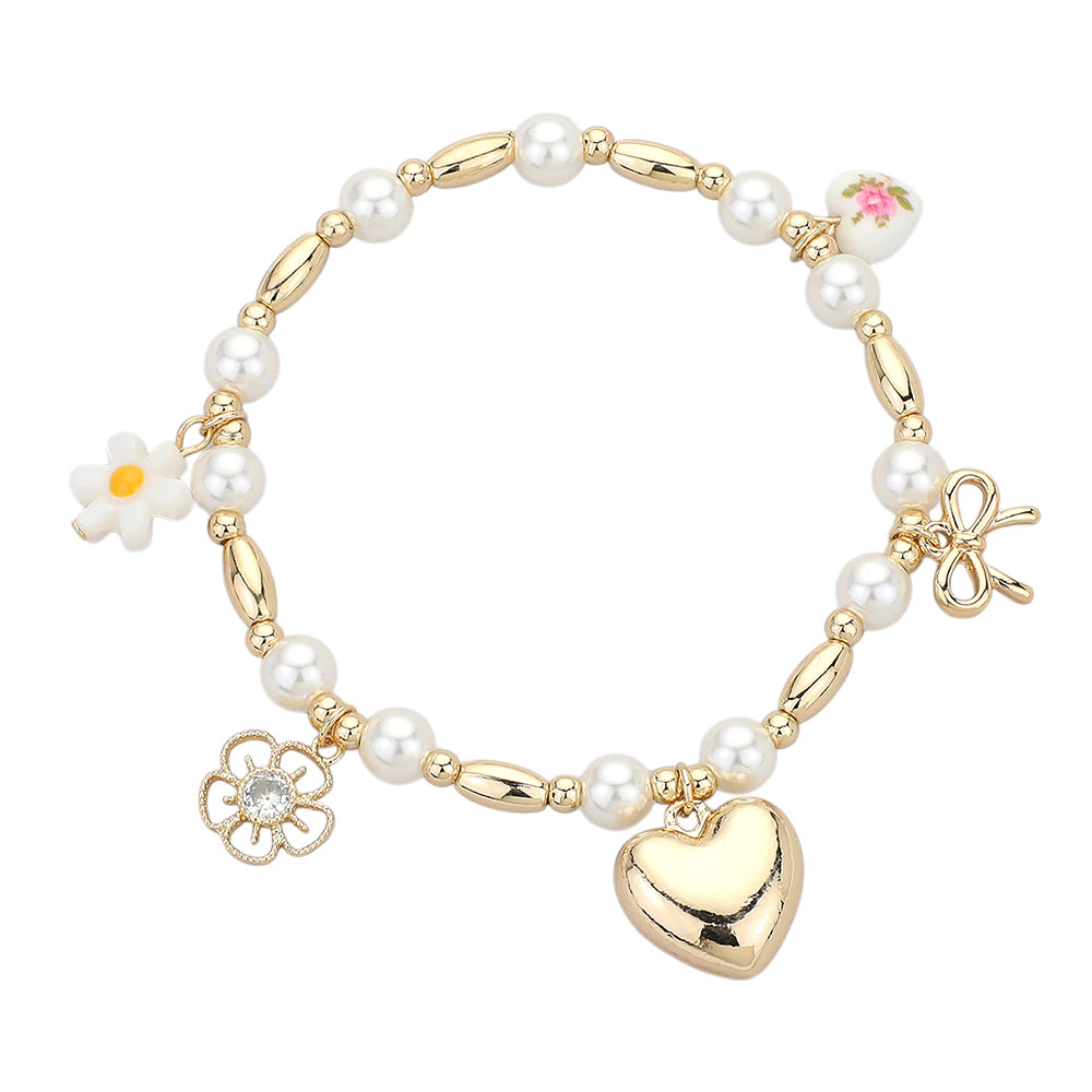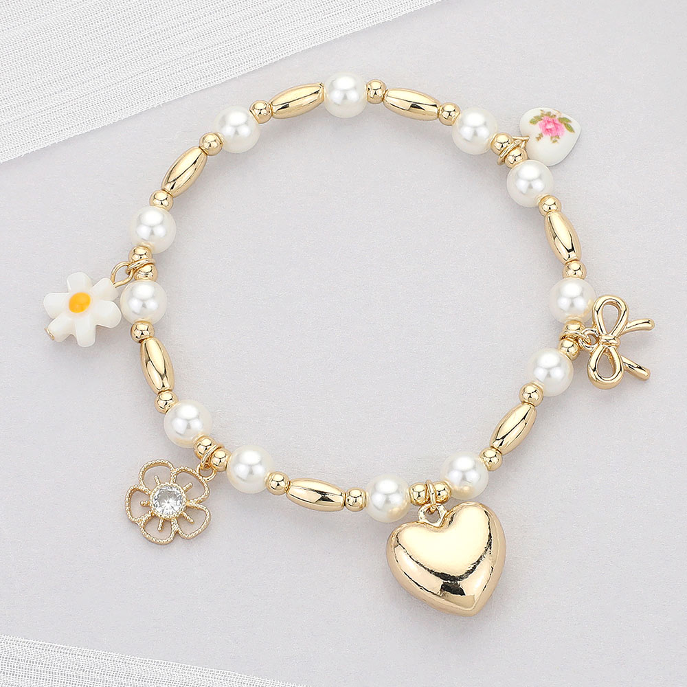 Metal Heart Bow Flower Ceramic Heart Charm Station Pearl Beaded Stretch Bracelet