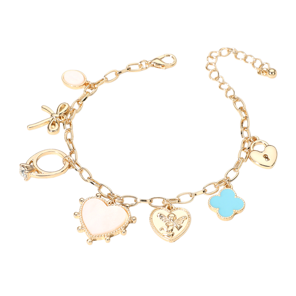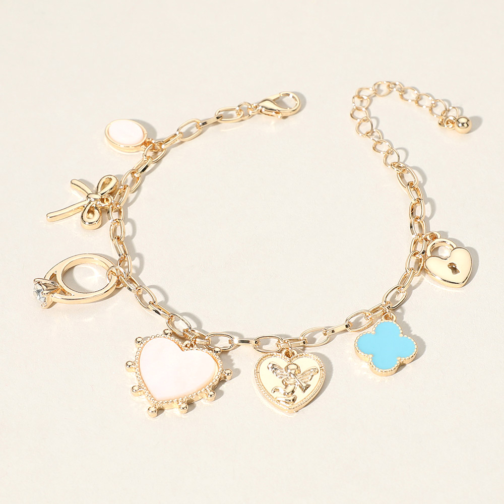 Mother of Pearl Heart Enamel Quatrefoil Metal Bow Lock Ring Charm Station Paperclip Chain Bracelet