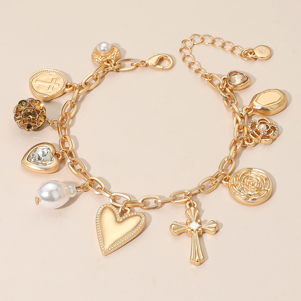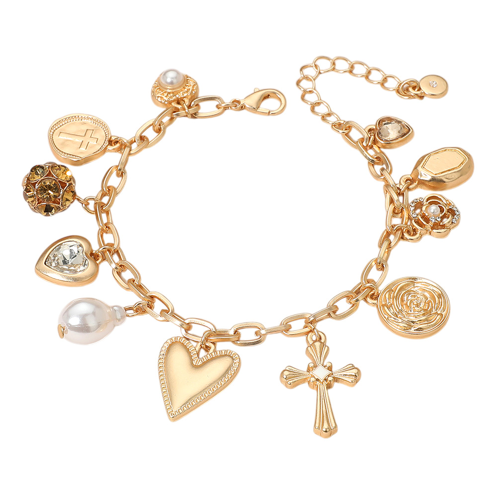 Details • Size : 0.2" H, 7.25" + 2.5" • Charm Size : 1.1" L • Lobster Clasp Closure • Chic charm bracelet adorned with a cross, hearts, floral motifs, pearls, and crystal accents. This versatile accessory blends elegance with symbolic details, making it perfect for casual wear or special occasions. Adjustable chain ensures a secure and comfortable fit for everyday style. • Lead and Nickel Compliant