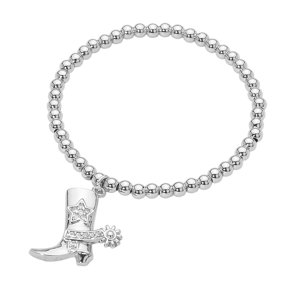 Stainless Steel CZ Stone Paved Star Accent Cowboy Boot Charm Beaded Stretch Bracelet