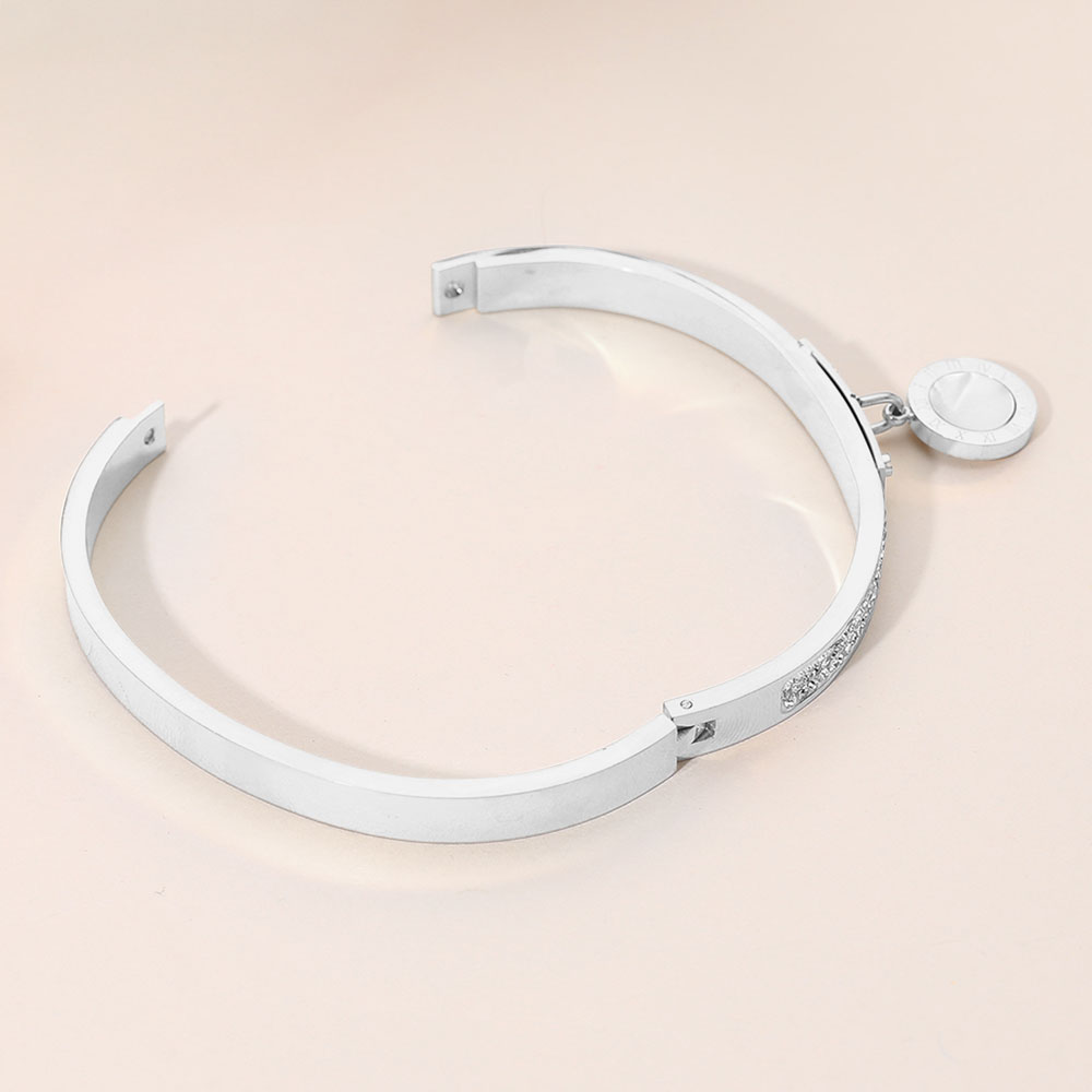 Details • Size : 0.25" H, 2.3" D • Charm Size : 0.7" L • Hinged Closure • Elegant charm bangle bracelet with a sleek profile and subtle sparkle accents. Designed for everyday styling or special occasions, it layers beautifully with other pieces or stands alone as a refined statement accessory, making it a timeless gift option. • CZ Cubic Zirconia • Stainless Steel