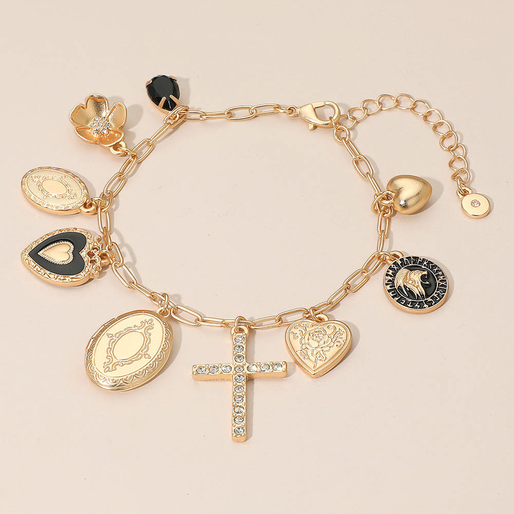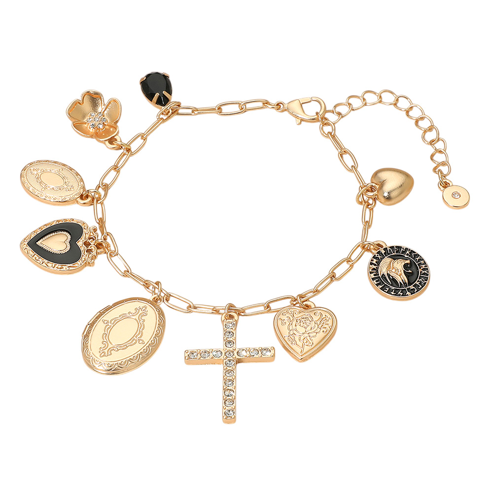 • Elegant charm bracelet featuring a sparkling cross, engraved hearts, and coin-inspired pendants for a stylish, meaningful accessory. The unique mix of charms adds character and versatility, making it a perfect choice for both everyday wear and special occasions. Adjustable fit ensures lasting comfort.