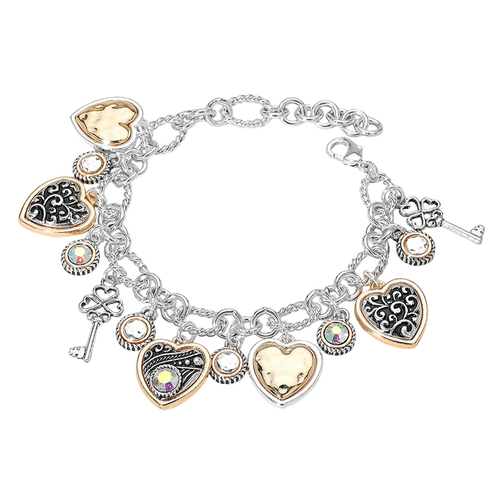 Two Tone Antique Metal Heart Clover Key Stone Charm Station Bracelet