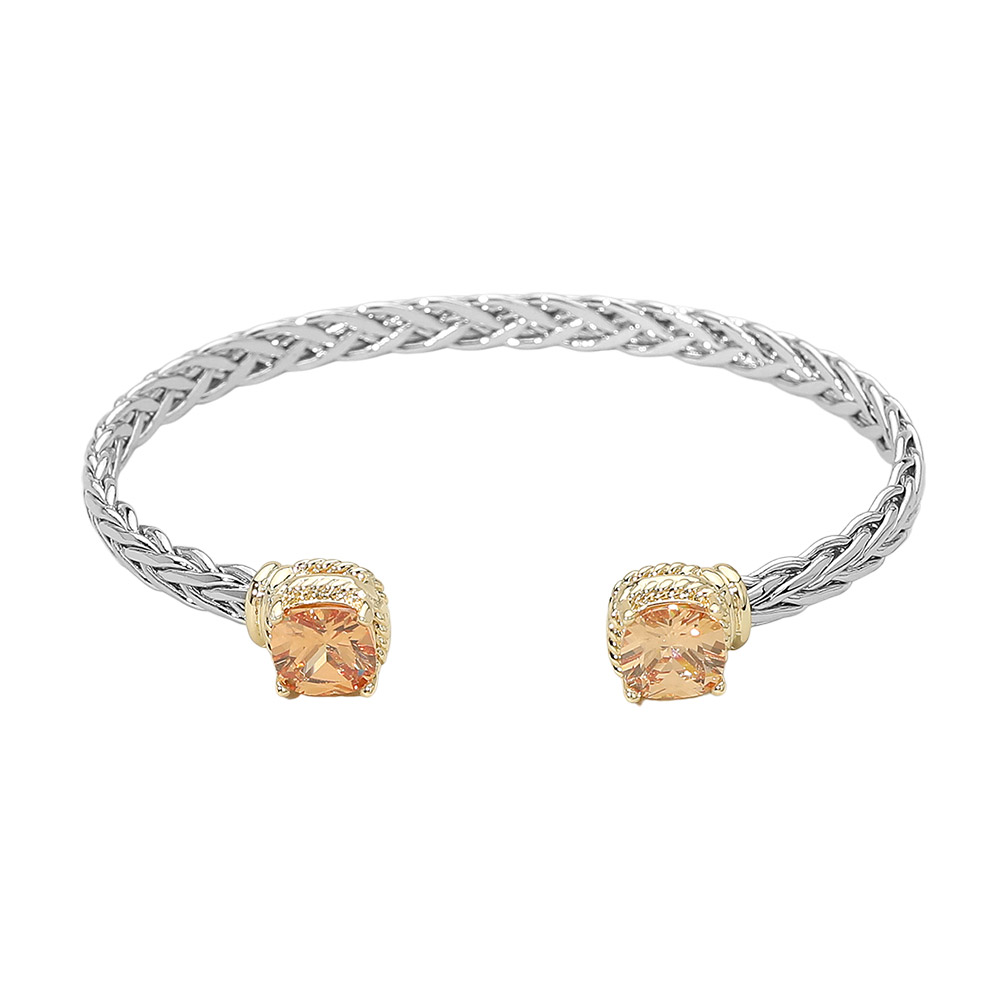 14K Gold Plated CZ Stone Tip Two Tone Braided Cuff Bracelet