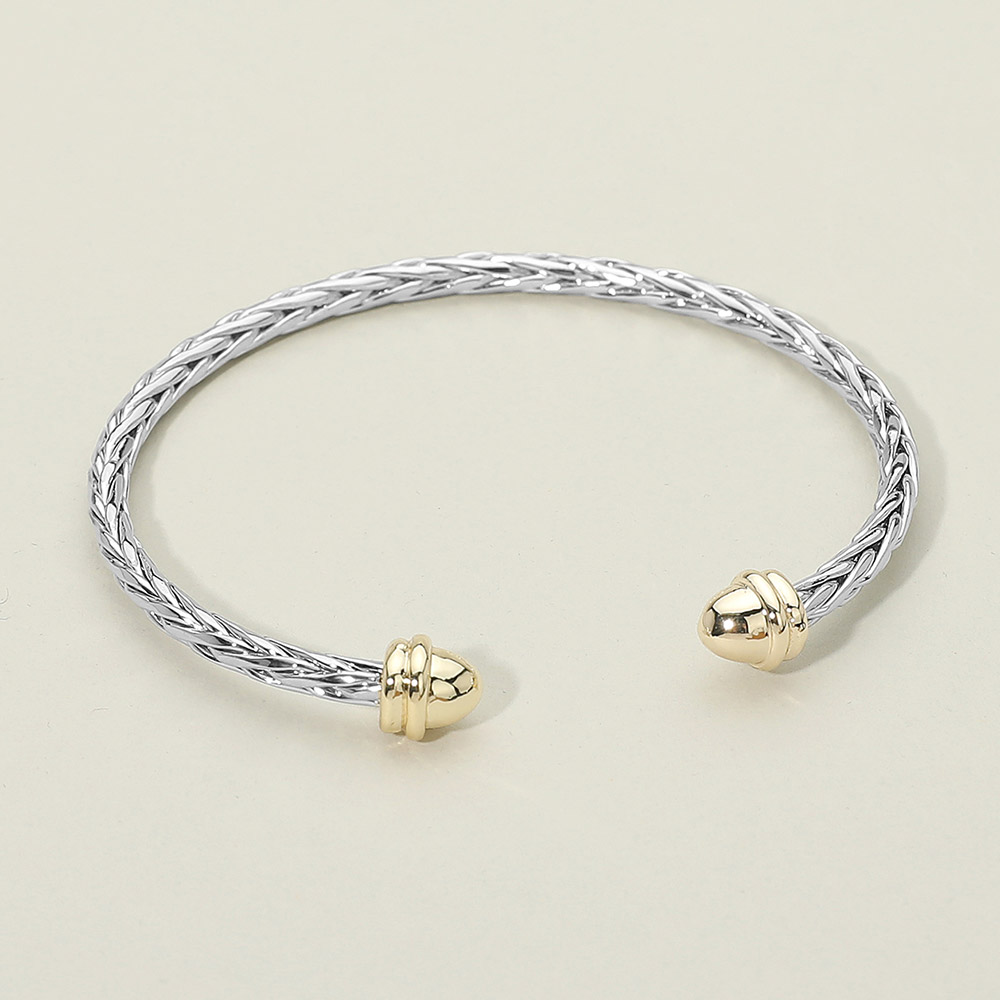 Details • Size : 0.25" H, 2.25" D • Cuff • Sleek cuff bracelet featuring a refined braided design and polished sculpted end caps for a modern yet timeless look. Designed for easy styling, this versatile accessory pairs effortlessly with casual or elevated outfits, making it ideal for boutiques, gifting, and everyday wear collections.