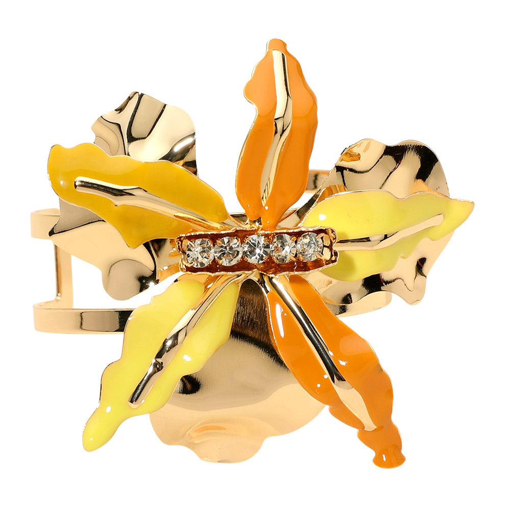 Details • Size : 3" H, 2.5" D • Cuff • Elegant statement cuff bracelet featuring a sculptural floral design with a sparkling center accent. Designed to elevate everyday outfits or special occasion looks, this eye-catching accessory adds dimension, shine, and modern charm to any jewelry collection. • Lead and Nickel Compliant