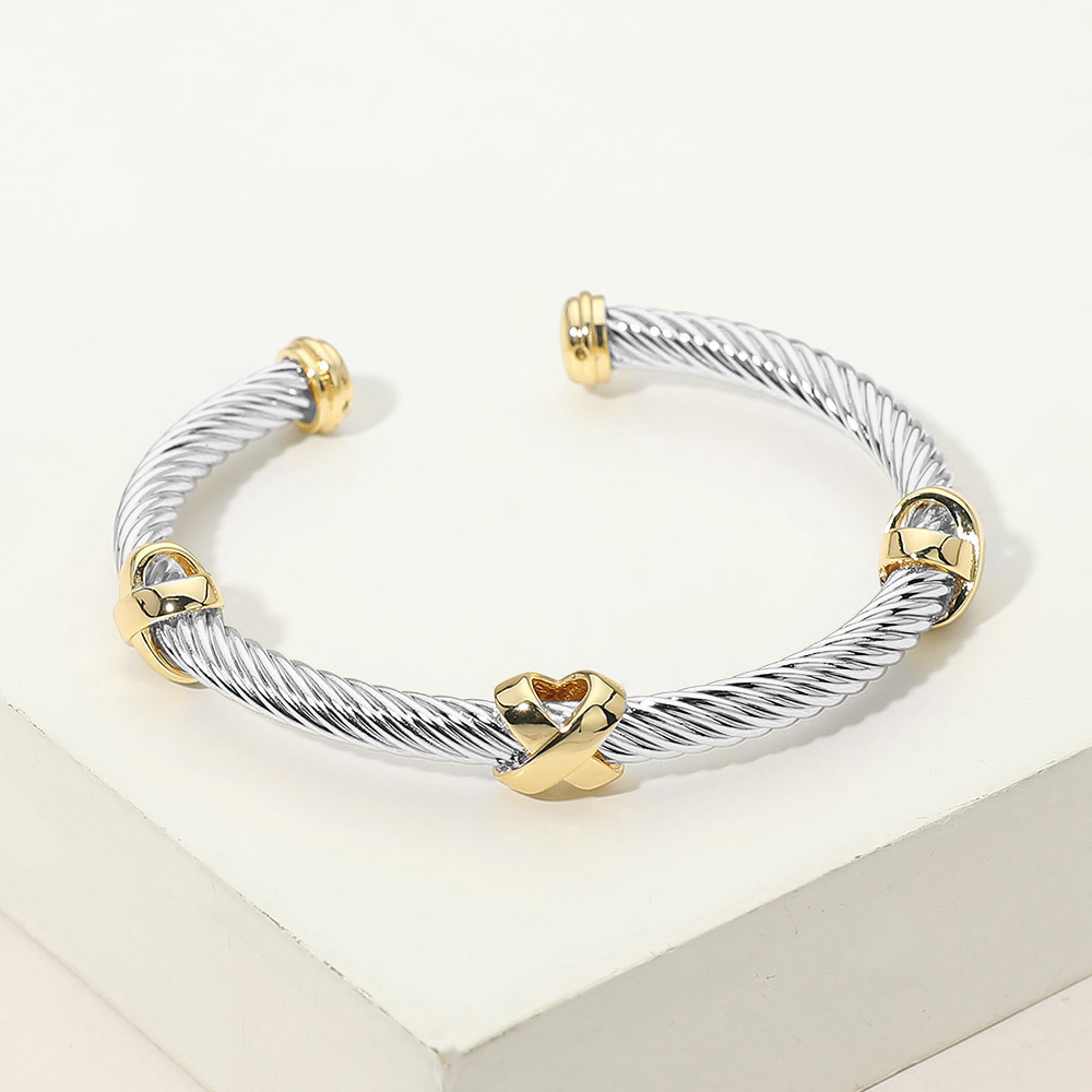 • Elegant open cuff bracelet featuring a twisted cable design with a sculpted heart accent at the center. Designed for easy wear and everyday styling, this timeless cuff adds a refined touch to casual and elevated looks, making it a versatile choice for boutiques, gifting, and layered jewelry collections.