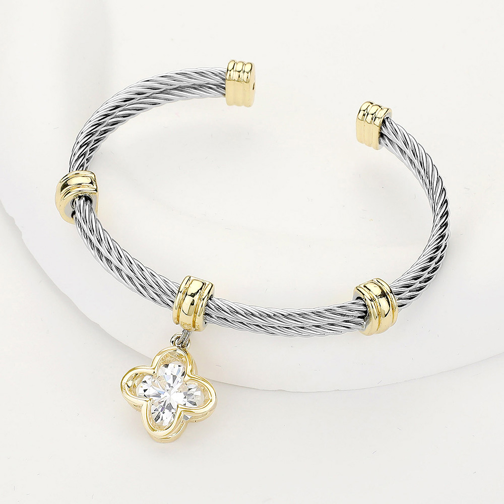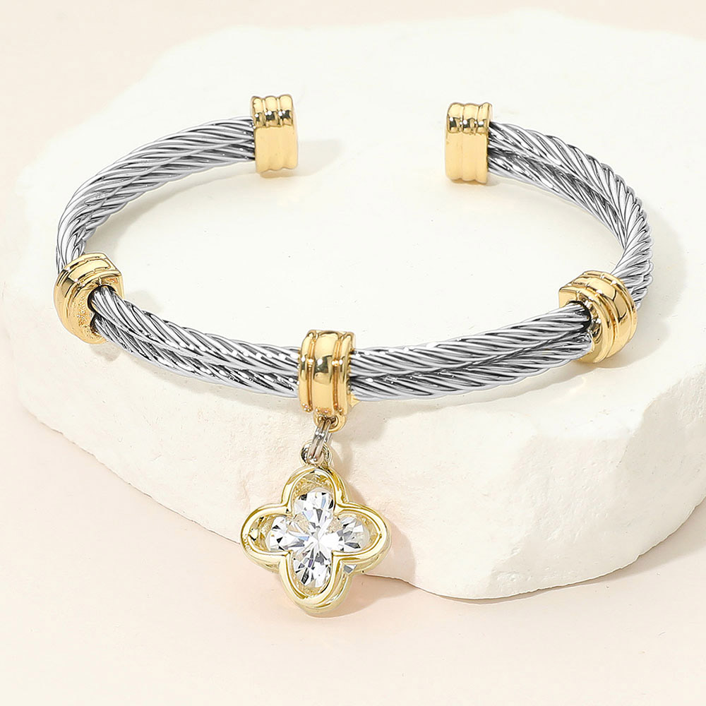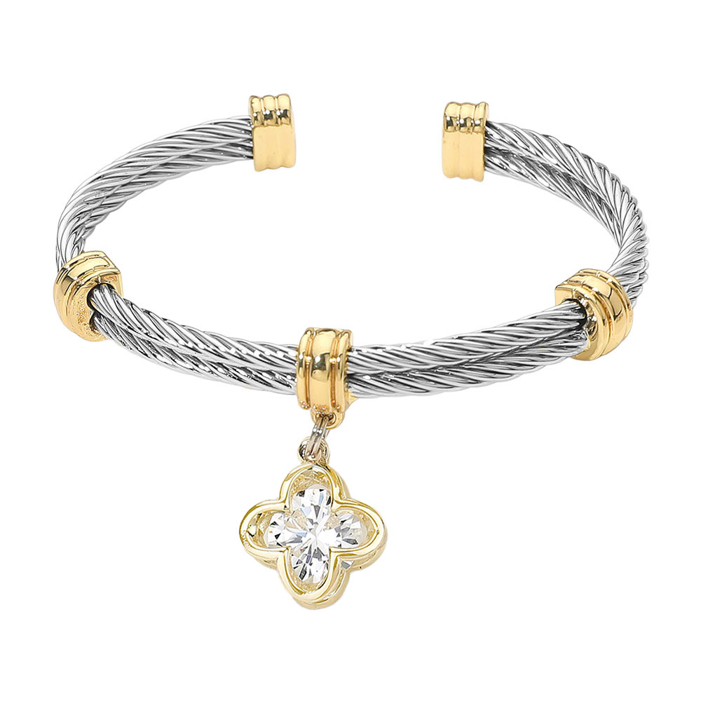 CZ Stone Quatrefoil Charm Dangle Cuff Bracelet