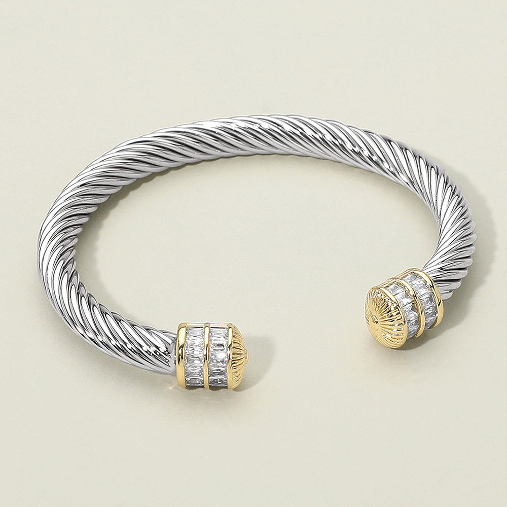 Details • Size : 0.3" H, 2.3" D • Cuff • Elegant twisted cable cuff bracelet featuring crystal-accented end caps with detailed design. A versatile piece that combines classic style with modern elegance, perfect for layering or wearing solo. Ideal for enhancing everyday outfits or gifting as a timeless jewelry accessory. • CZ Cubic Zirconia