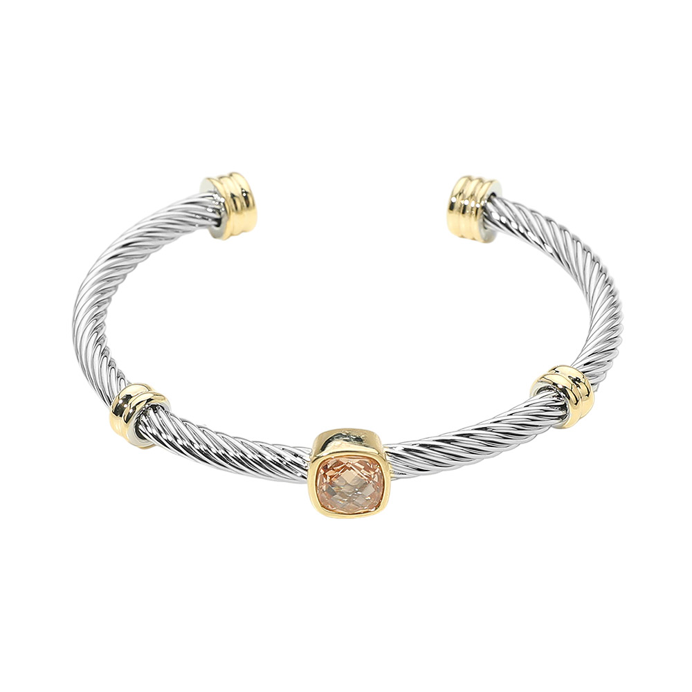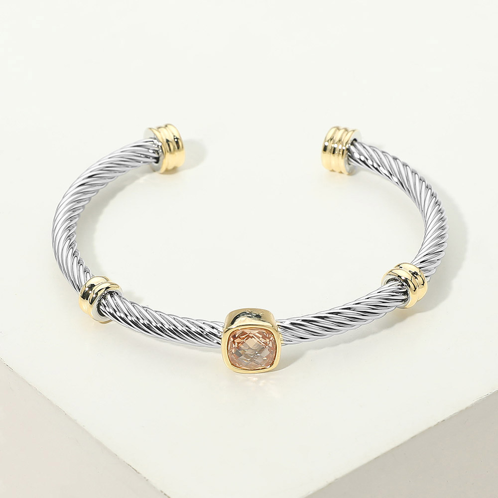 Square CZ Bezel Accent Two Tone Twisted Cable Cuff Bracelet