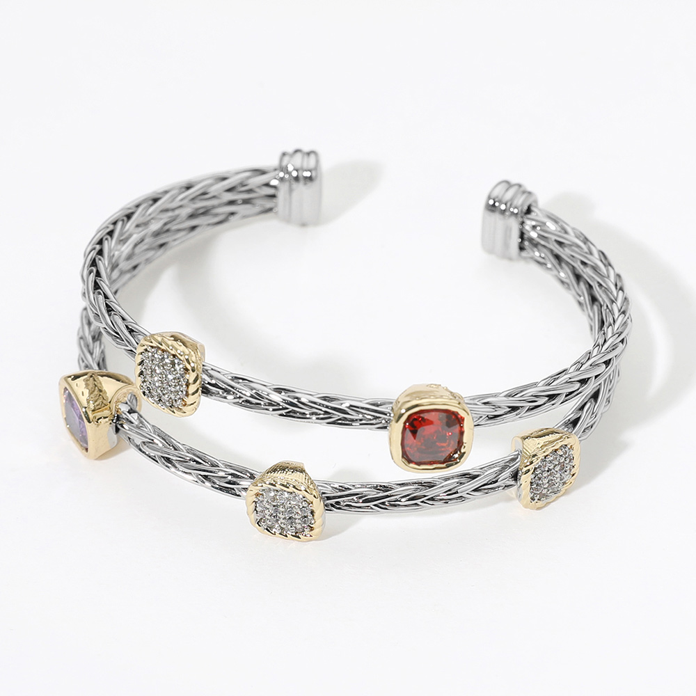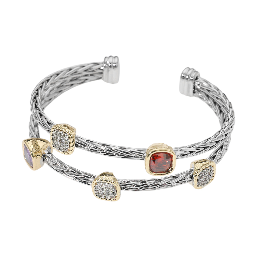 Square CZ Stone Cluster Pointed Triple Cable Split Cuff Bracelet