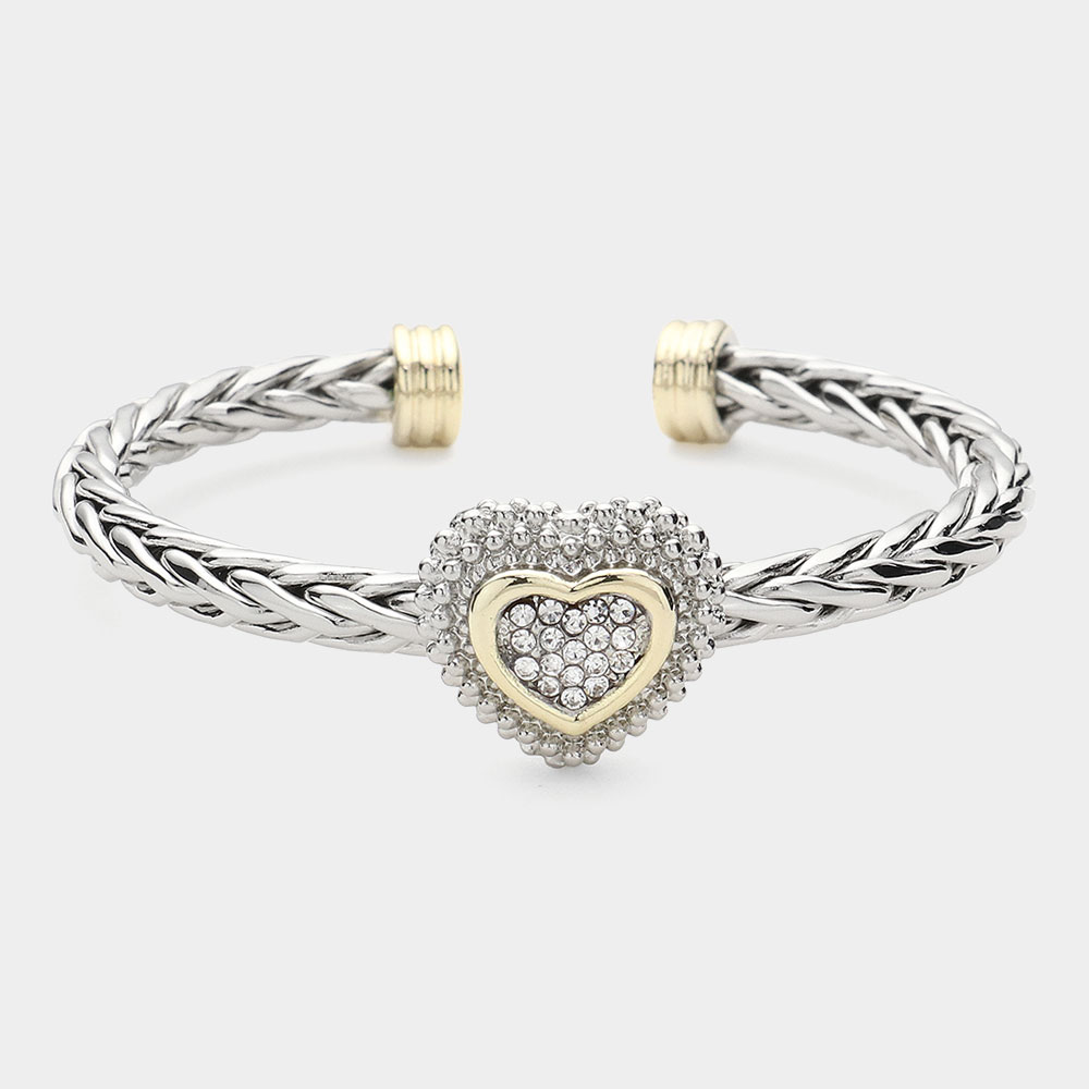 Stone Paved Heart Pointed Two Tone Braided Metal Cuff Bracelet