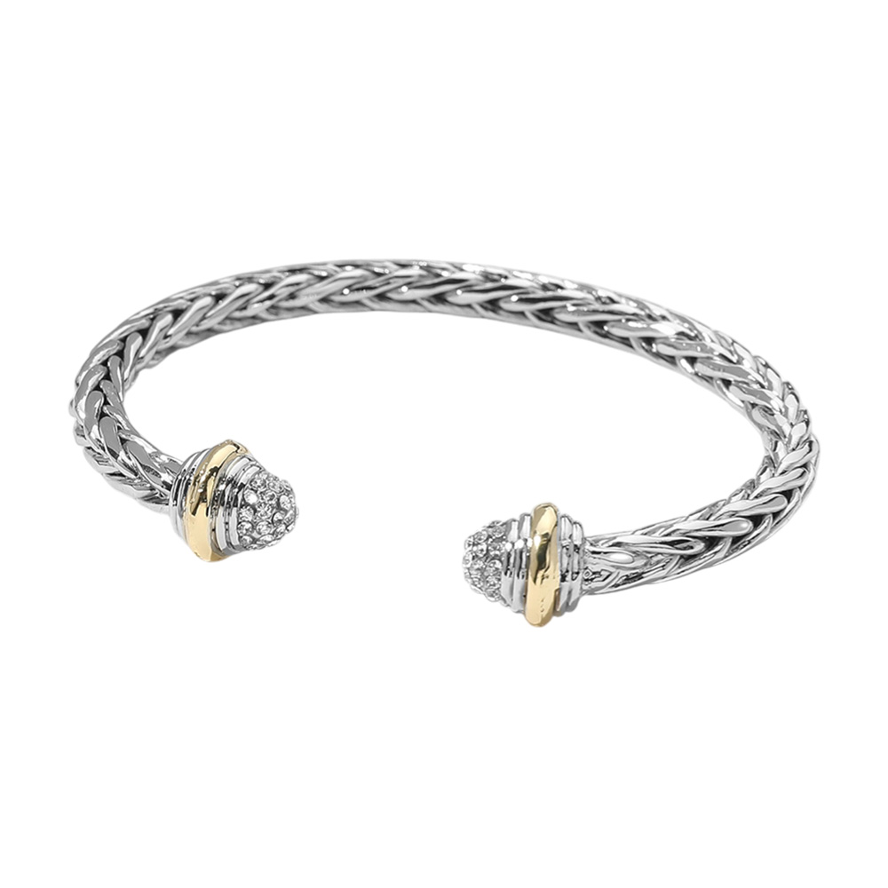 Stone Paved Tip Two Tone Metal Braided Cuff Bracelet