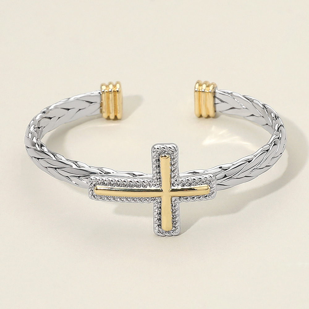 Details • Size : 0.8" H, 2.1" D • Cuff • Braided Cross Cuff Bracelet showcases a textured rope-style band with a bold cross centerpiece for a striking, symbolic accent. The open cuff design offers easy wear and a comfortable fit, making it ideal for everyday styling or meaningful gift giving.