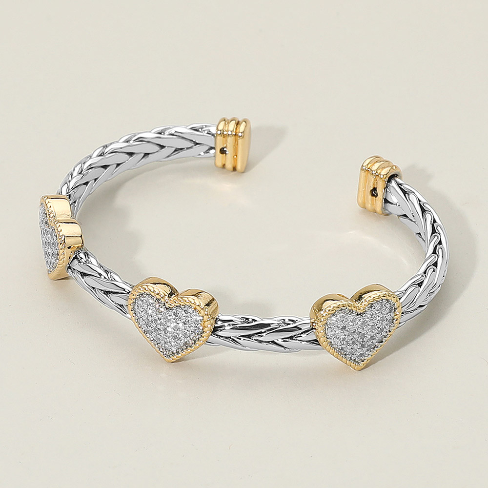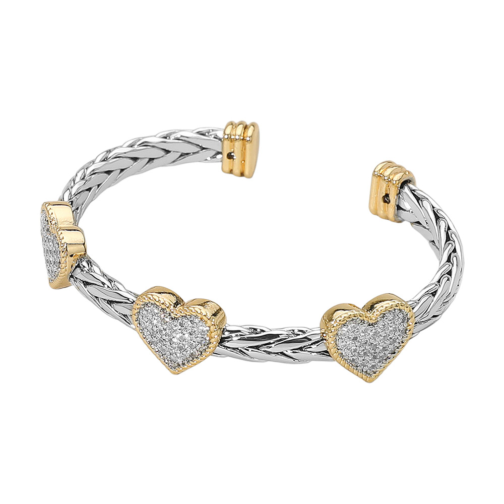Details • Size : 0.5" H, 2.3" D • Cuff • Elegant open cuff bracelet featuring three sparkling cz pave heart accents along a braided band. A stylish, lightweight accessory that adds a touch of charm to everyday outfits or special occasions, offering a standout heart-themed design. • CZ Cubic Zirconia