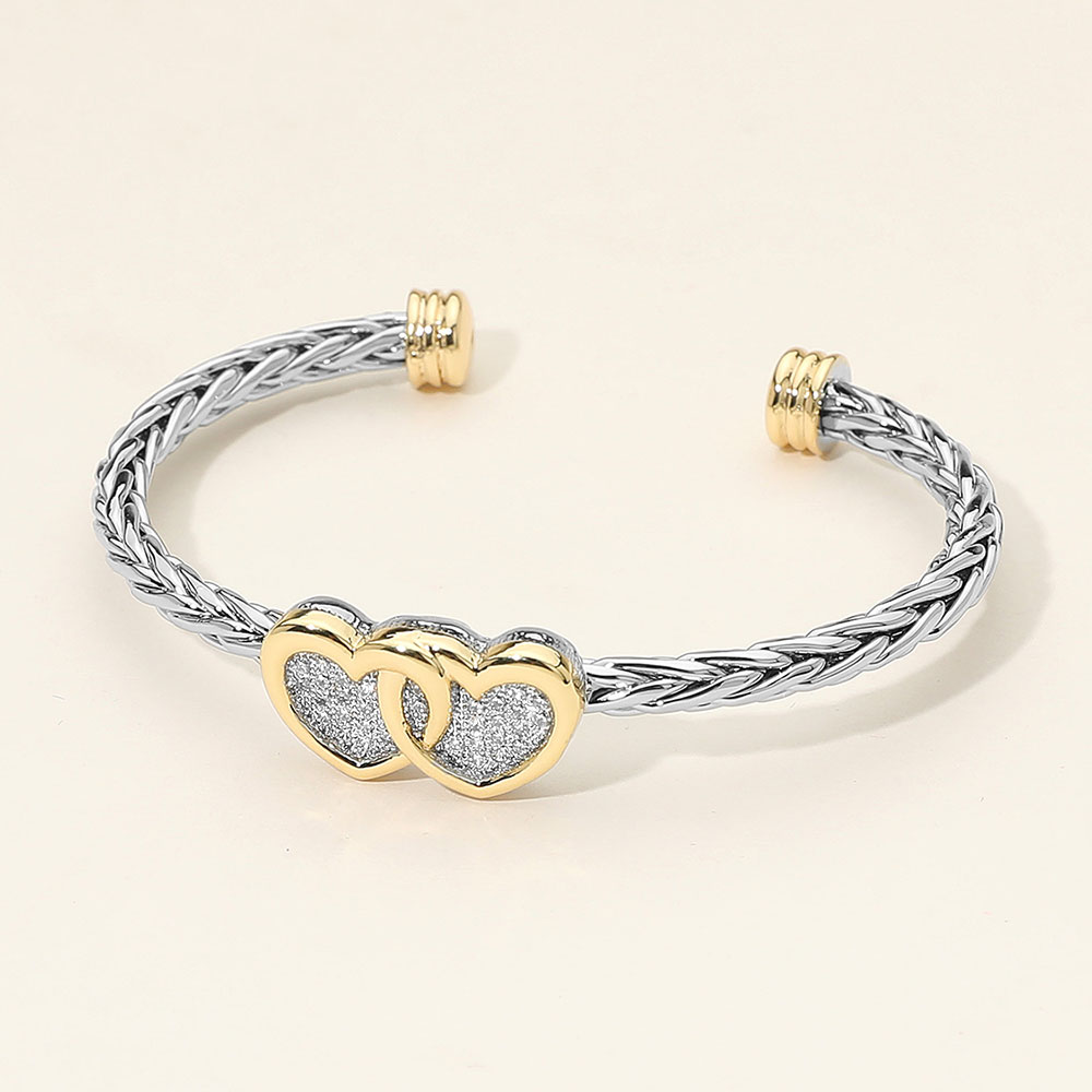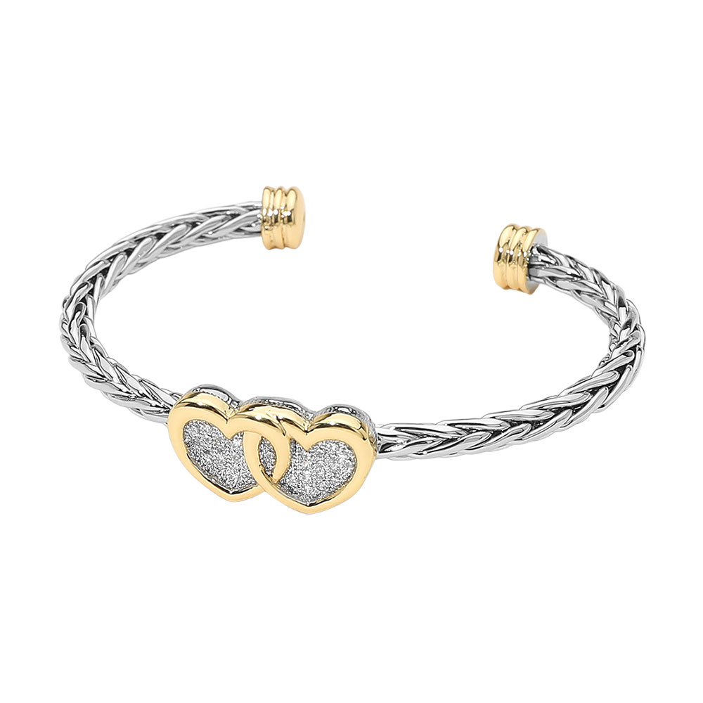 Details • Size : 0.5" H, 2.4" D • Cuff • This romantic braided cuff bracelet features two interlocking heart accents symbolizing unity and love. With its open cuff design and refined dual-tone finish, it offers a timeless look that complements both casual and elegant outfits, perfect for meaningful gifting. • CZ Cubic Zirconia