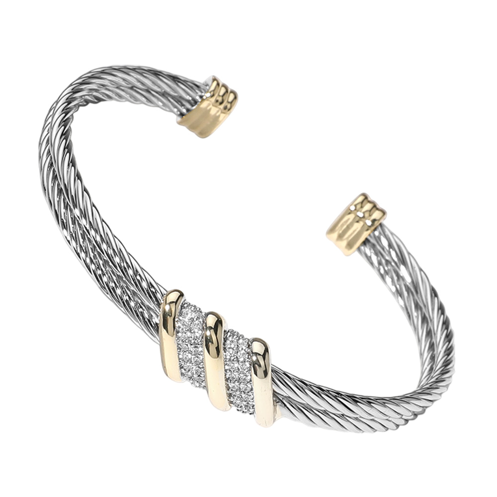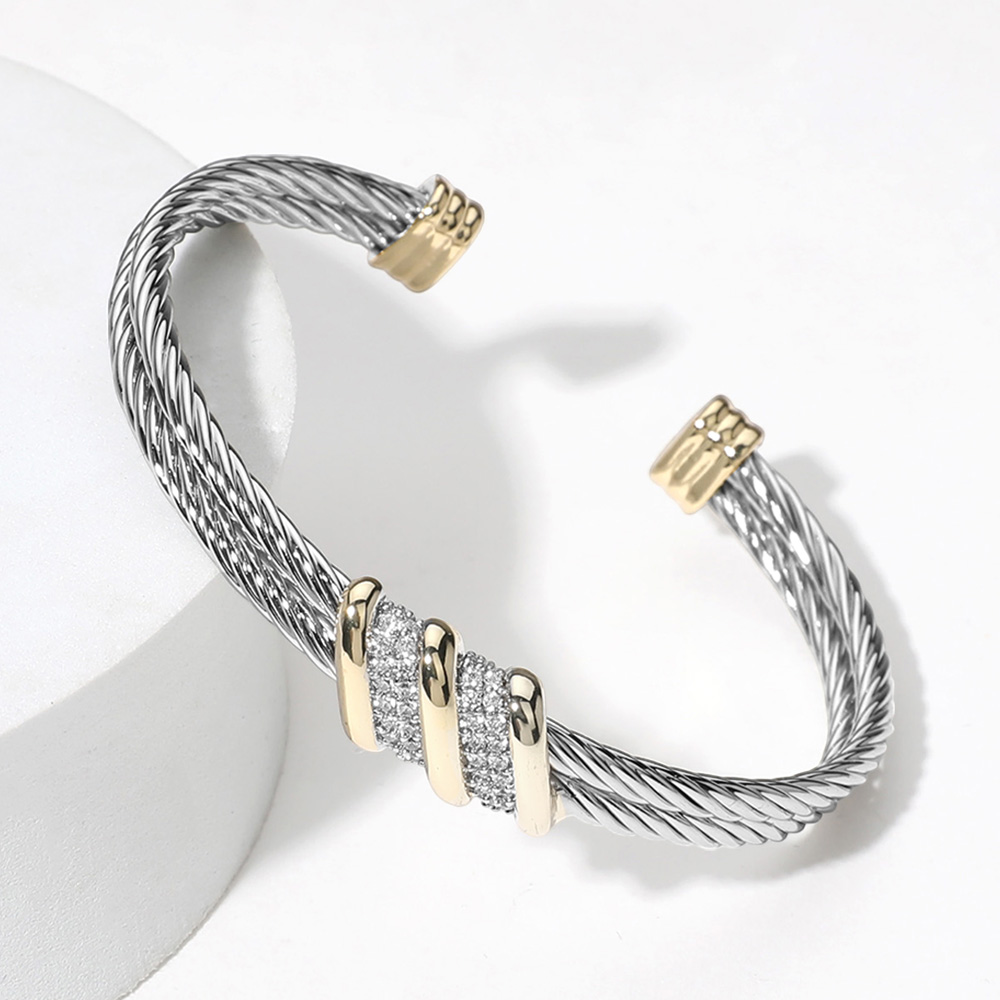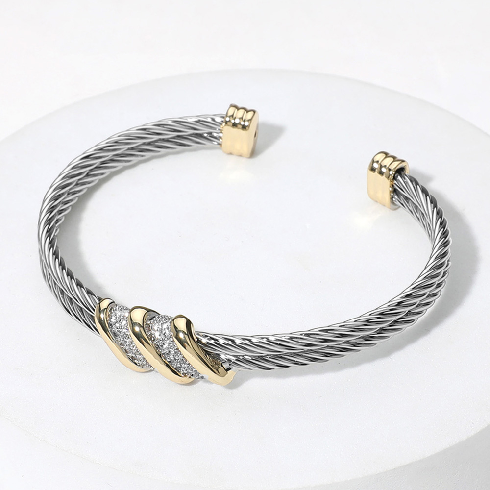 Details • Size : 0.4" H, 2.3" D • Cuff • Add a modern touch to your style with this two-tone cable cuff bracelet featuring sleek metallic strands and crystal-accented bars. Its open design ensures a comfortable fit, while the refined blend of tones makes it versatile for both everyday wear and special occasions. • CZ Cubic Zirconia
