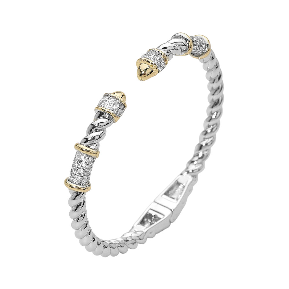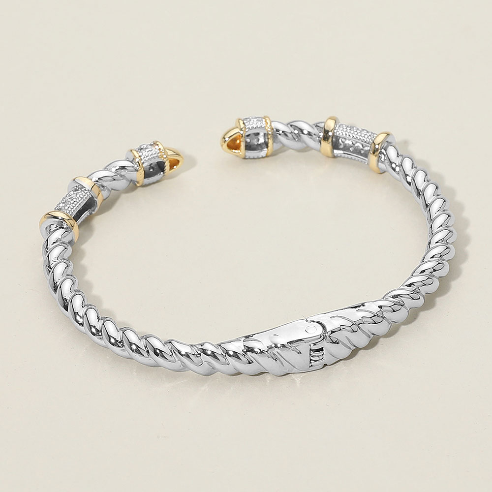 Details • Size : 0.25" H, 2.4: D • Hinged Closure / Cuff • Sophisticated open cuff bracelet featuring a braided band with crystal accent stations and polished end details. Designed for refined styling, this statement piece adds elegant sparkle while remaining versatile for everyday wear, special occasions, and effortless bracelet layering. • CZ Cubic Zirconia