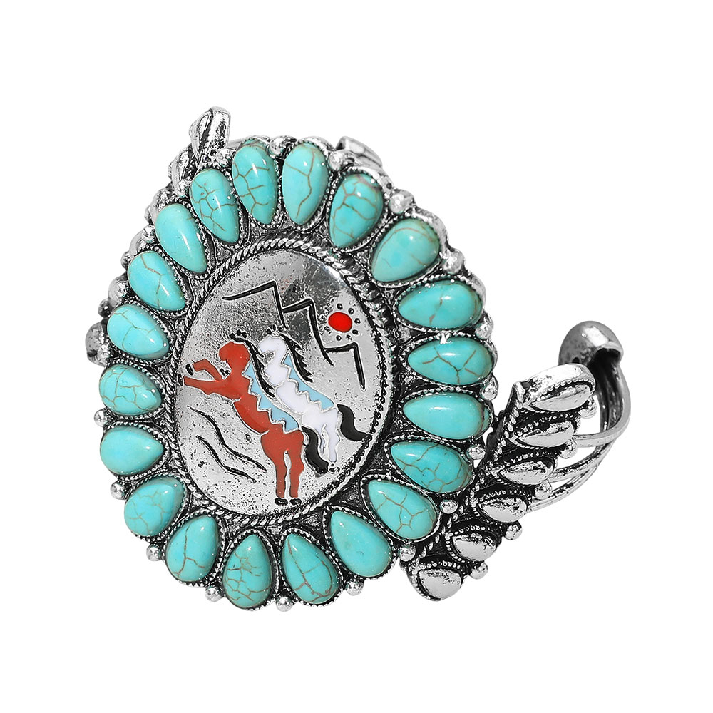 • Make a bold style statement with this western-inspired horse oval cuff bracelet featuring an intricate central motif framed by stone-look accents. The adjustable open design offers comfortable wear while delivering standout visual appeal for casual outfits, festivals, or themed styling.