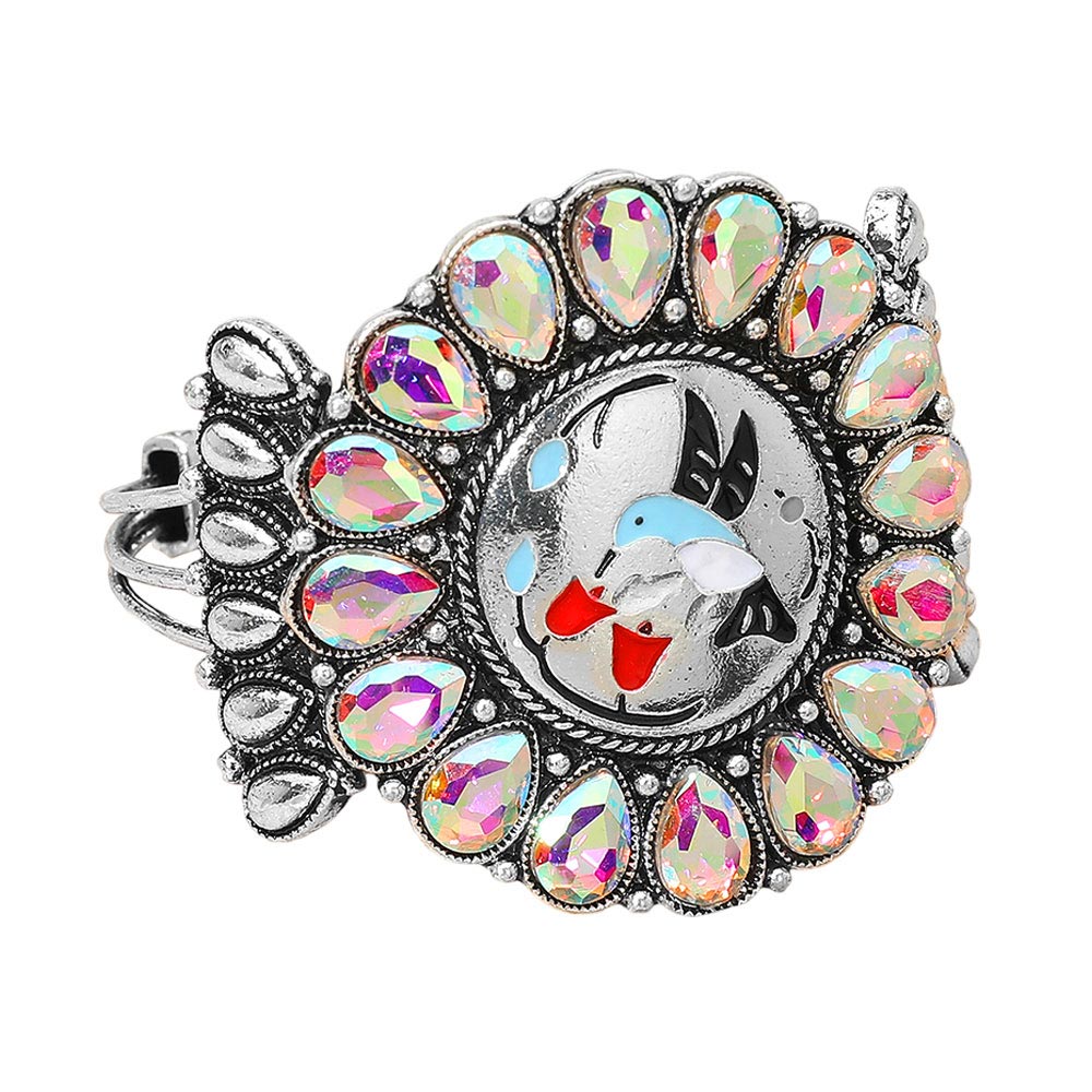 Details • Size : 2.1" H, 2.5" D • Cuff • Make a bold statement with this western-inspired hummingbird cuff bracelet featuring an ornate center scene framed by faceted teardrop accents. The adjustable open design sits comfortably on the wrist, adding radiant sparkle and artistic flair to casual outfits, festivals, or special events. • Lead and Nickel Compliant
