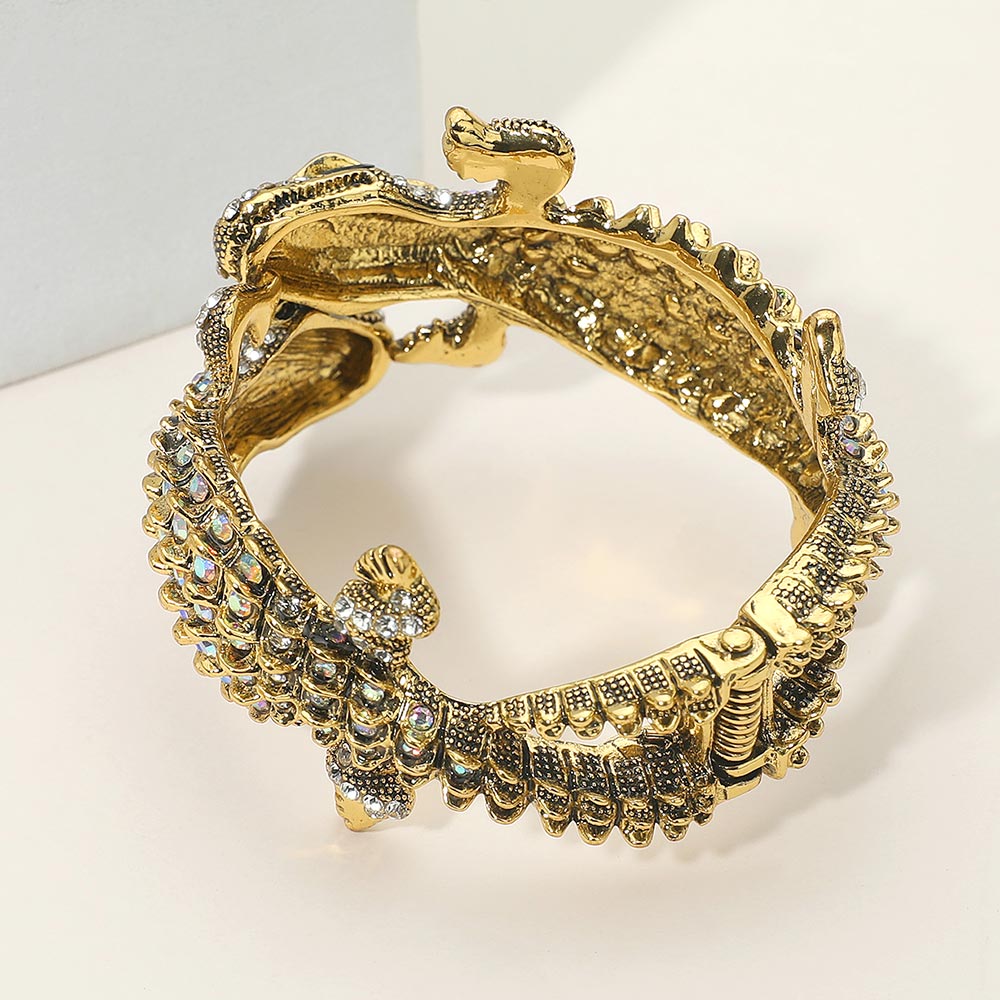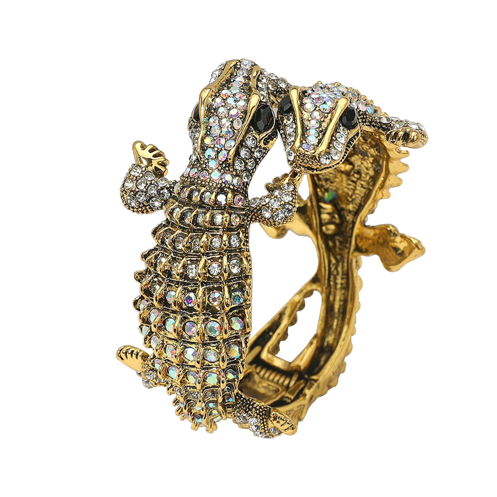 • Make a bold statement with this crystal-studded alligator cuff bracelet. Featuring twin alligator designs encrusted with sparkling rhinestones, this hinged bangle brings fierce style and eye-catching detail to any outfit. A standout piece for animal lovers and fashion risk-takers.