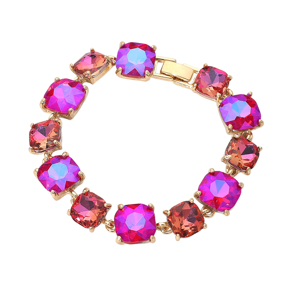 Details • Size : 0.5" H, 7.5" L • Fold Over Closure • Elegant bracelet featuring sparkling square-cut crystals with a vivid, reflective finish. Ideal for parties, weddings, or adding brilliance to formal looks. A radiant accessory that commands attention. • Lead and Nickel Compliant