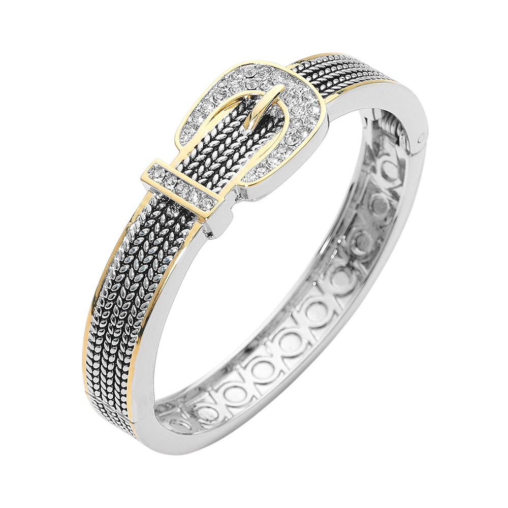 Details • Size : 0.75" H, 2.5" D • Hinged Closure • Statement hinged bangle bracelet featuring a bold buckle-inspired design with textured detailing and a sparkling accent. Structured silhouette provides a secure, comfortable fit for everyday wear or special occasions. Perfect worn alone or stacked, ideal for boutiques seeking modern, elevated jewelry pieces. • CZ Cubic Zirconia