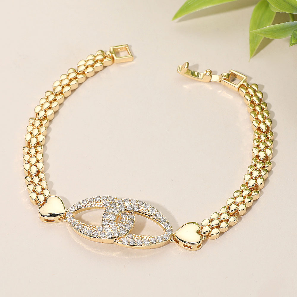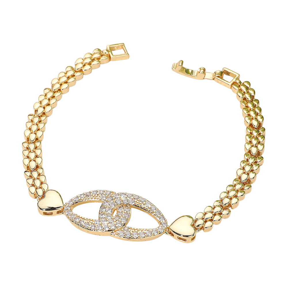 Details • Size : 0.6" H, 7.25" L • Fold Over Closure • This bracelet features a radiant interlocking centerpiece heart link adorned with sparkling crystal accents. Its intricate chain design adds a touch of elegance and modern allure, making it the perfect statement accessory for enhancing both casual and formal looks. • Brass • CZ Cubic Zirconia