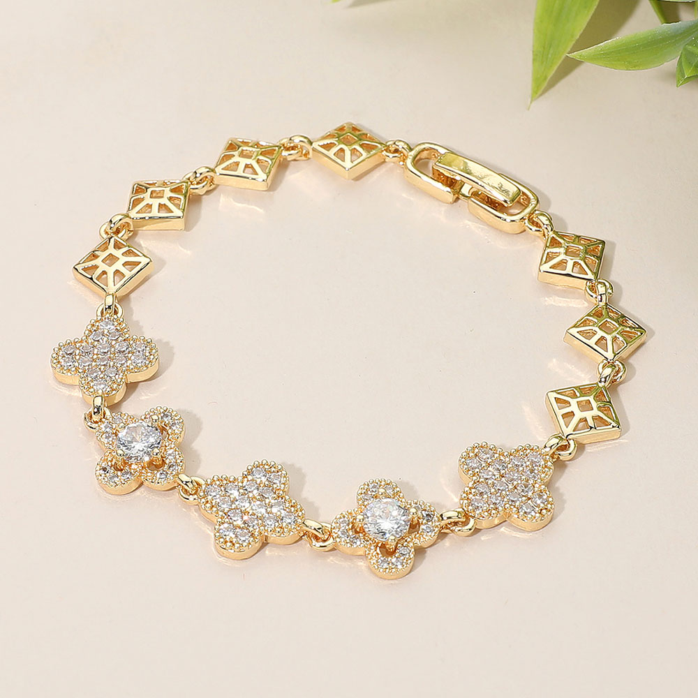 Details • Size : 0.5" H, 7.25" L • Fold Over Closure • This quatrefoil motif bracelet radiates elegance with its delicate flower-shaped links adorned with sparkling crystal accents. Perfectly balanced between classic charm and modern sophistication, it adds a refined touch to any outfit, making it a timeless piece for all occasions. • Brass • CZ Cubic Zirconia