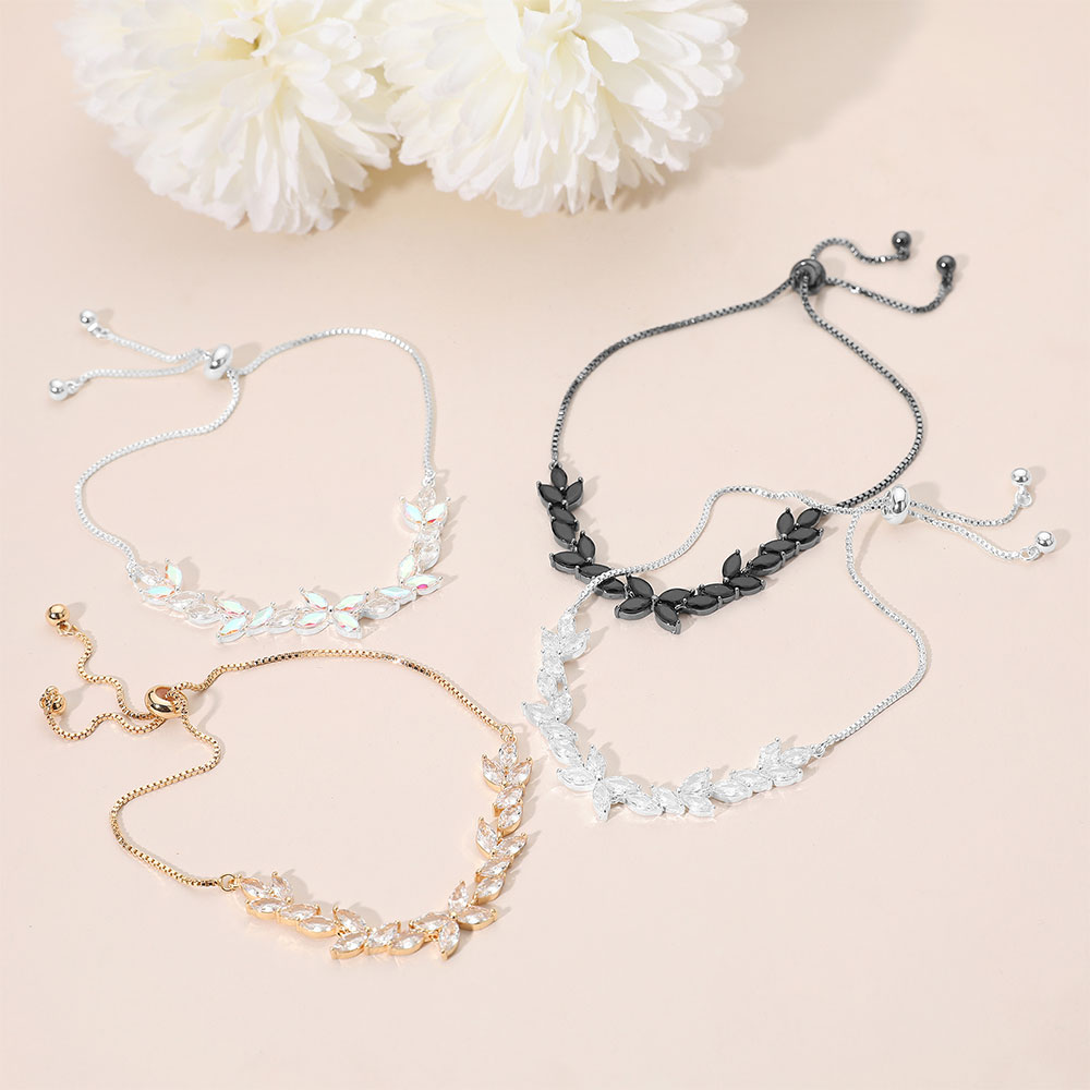 • This adjustable bracelet features a graceful leaf motif adorned with shimmering crystals, creating a refined and radiant look. Designed for comfort and elegance, it’s an ideal choice for adding subtle sophistication to formal attire or elevating your everyday ensemble effortlessly.