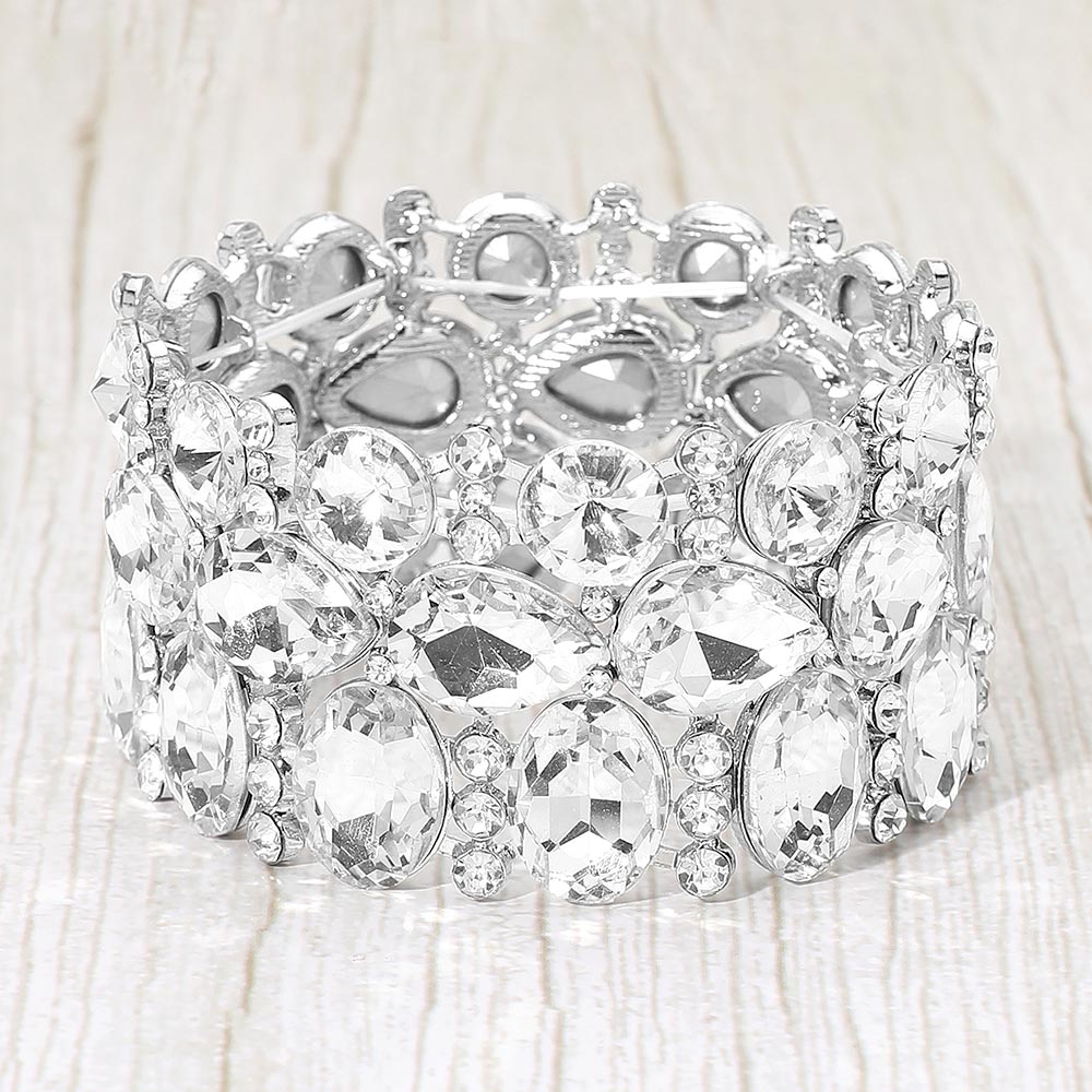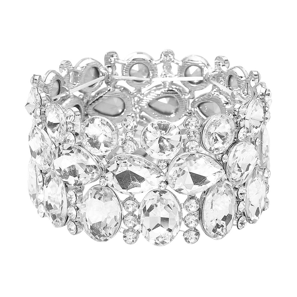 Details • Size : 1.6" H, 2.5" D • Stretchable • This elegant gemstone statement bracelet dazzles with a stunning mix of oval and round-cut stones arranged in an intricate pattern. Designed to catch the light from every angle, it adds sophistication and glamour to any ensemble—perfect for special occasions or evening wear. • Lead and Nickel Compliant
