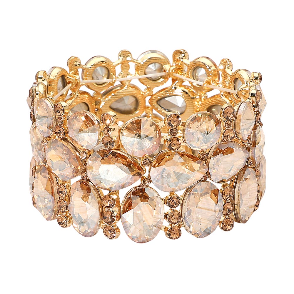 Details • Size : 1.6" H, 2.5" D • Stretchable • This elegant gemstone statement bracelet dazzles with a stunning mix of oval and round-cut stones arranged in an intricate pattern. Designed to catch the light from every angle, it adds sophistication and glamour to any ensemble—perfect for special occasions or evening wear. • Lead and Nickel Compliant
