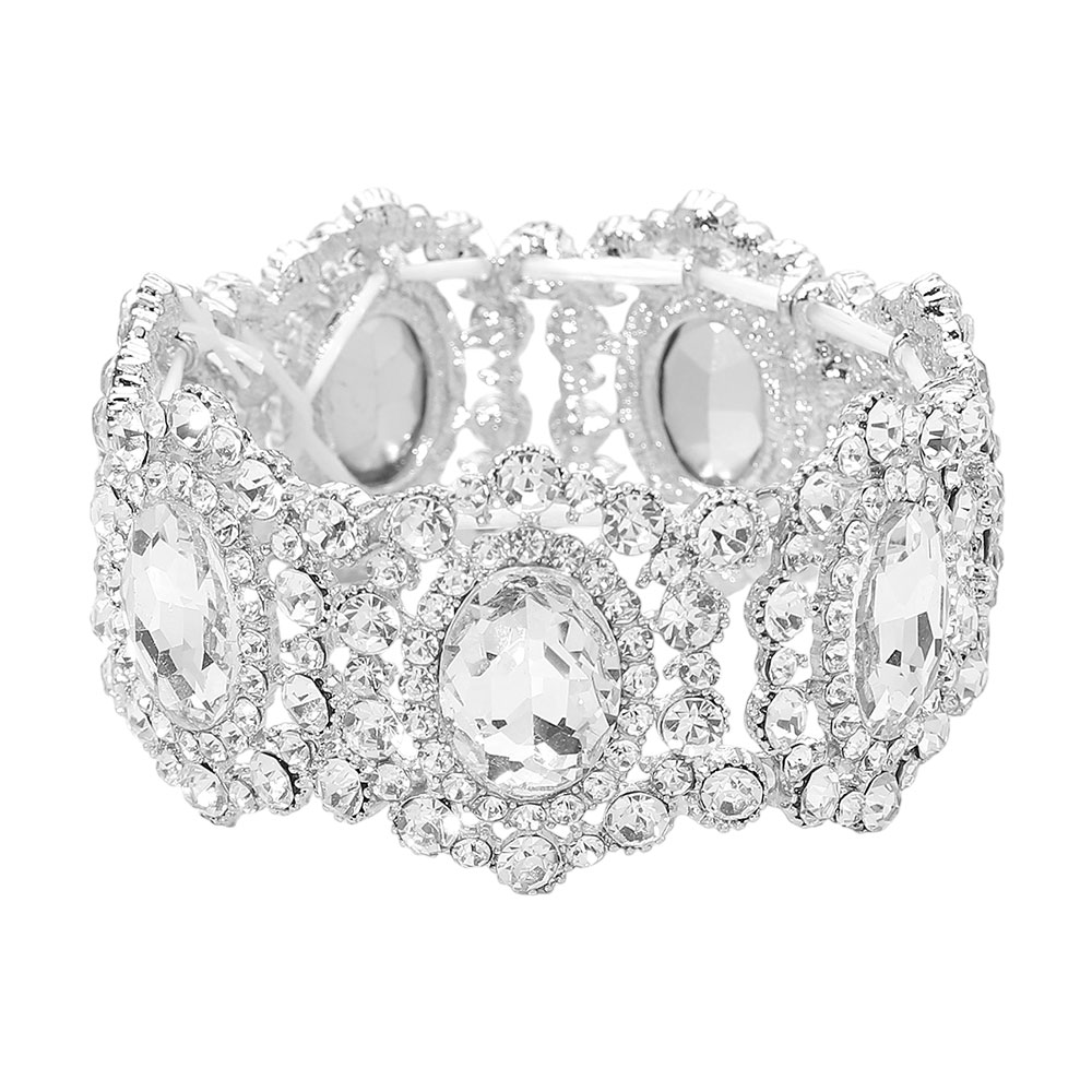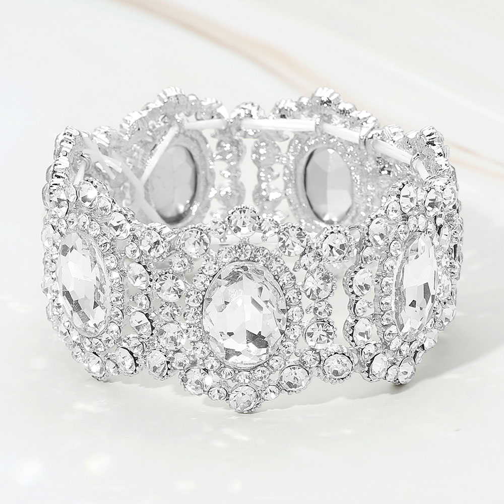 Details • Size : 1.4" H • Stretchable • Eye-catching stretch bracelet featuring oval center accents surrounded by layered crystal detailing. Designed to deliver bold elegance with comfortable wear, this statement bracelet elevates evening looks, special occasions, formal outfits, and standout everyday styling with timeless glamour. • Lead and Nickel Compliant