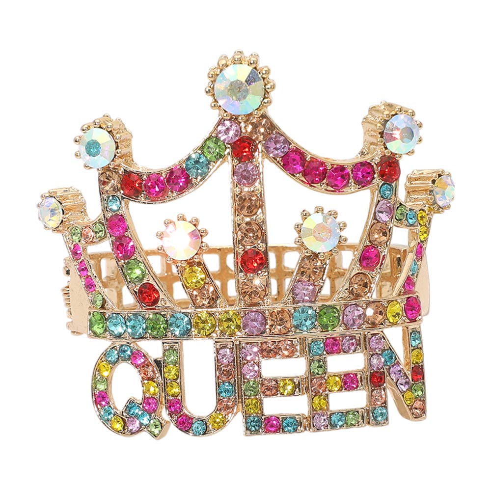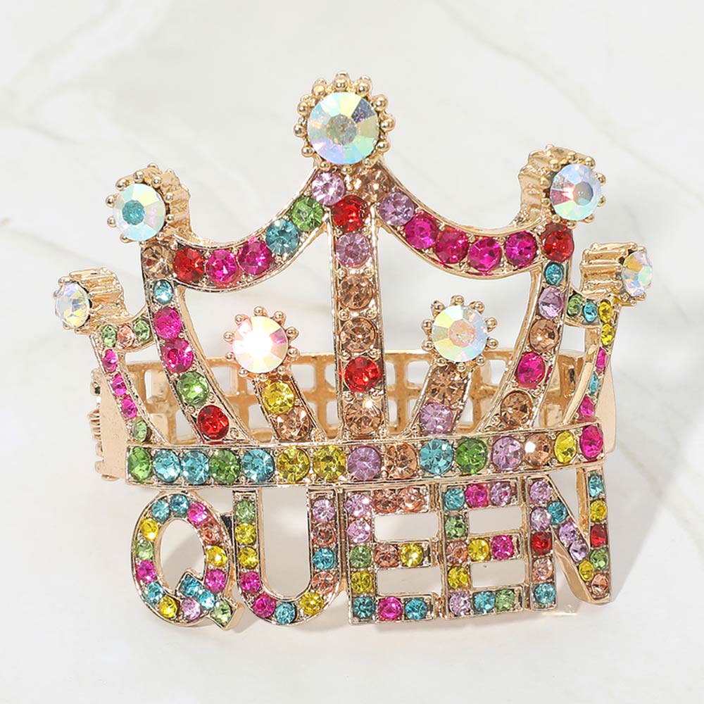 • This queen crown statement brooch features a bold crown silhouette with sparkling stone accents and a raised QUEEN lettering design. A striking accessory for jackets, dresses, bags, or hats, perfect for fashion-forward styling, gifting, pageant looks, event wear, and boutique jewelry collections seeking a confident, eye-catching statement piece.