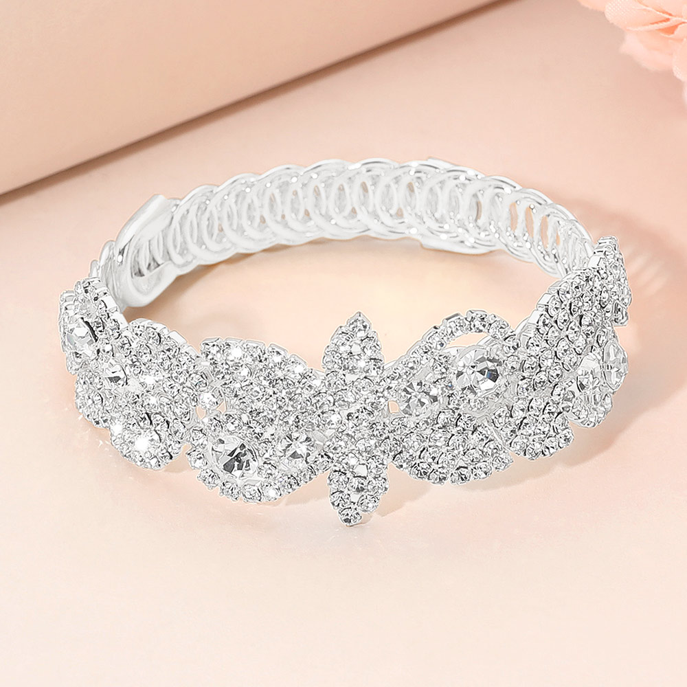 • Enhance your elegance with this crystal leaf floral adjustable bracelet. Featuring intricate leaf motifs encrusted with radiant crystals, it sparkles beautifully under any light. The flexible design offers a comfortable fit, making it the perfect statement piece for special occasions or evening wear.
