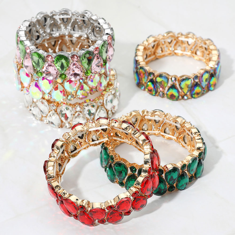 • Elegant stretch bracelet adorned with sparkling teardrop and round gemstones in a bold, eye-catching design. Comfortable to wear and perfect for special occasions, this bracelet adds a touch of glamour to any outfit.