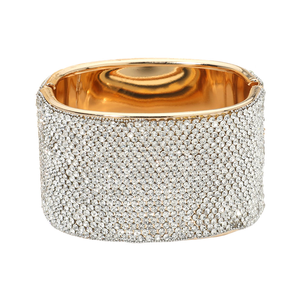 • Statement bangle bracelet featuring a bold, wide silhouette with a smooth interior and secure hinge closure. Designed to elevate evening looks, bridal styling, and special occasions, this bracelet delivers high-impact shine and a polished finish for confident, standout accessorizing.