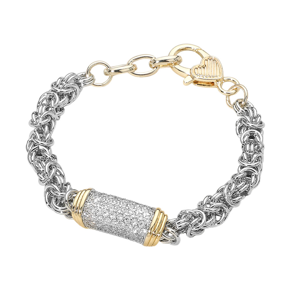 Details • Size : 0.5" H, 7.25" + 1" L • Lobster Clasp Closure • A bold mixed-link bracelet featuring an intricate woven design and a shimmering centerpiece that adds standout brilliance. This stylish accessory brings a refined, eye-catching touch to everyday outfits or evening looks, offering a chic blend of texture and sparkle for any occasion. • CZ Cubic Zirconia • Gold Dipped