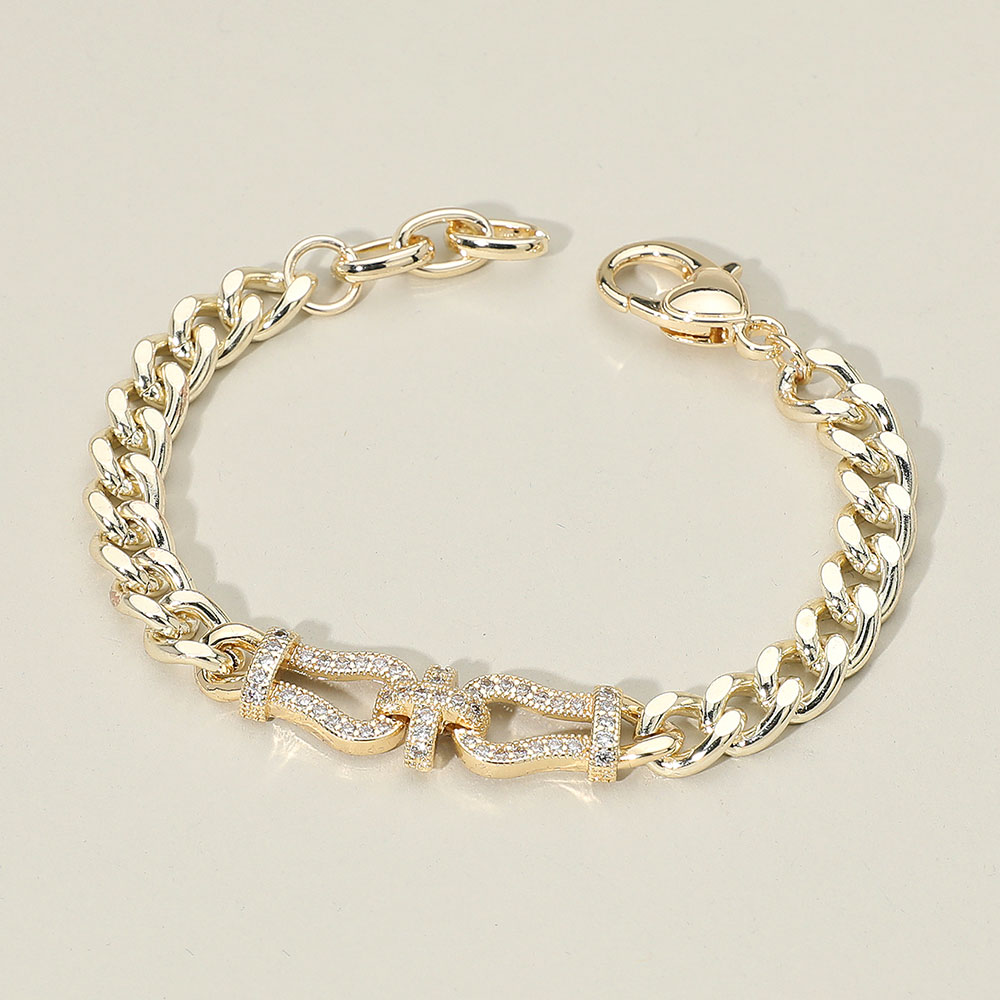 14K Gold Plated CZ Stone Paved Horsebit Accent Chunky Cuban Chain Bracelet 14K Gold Plated CZ Stone Paved Horsebit Accent Chunky Cuban Chain Bracelet