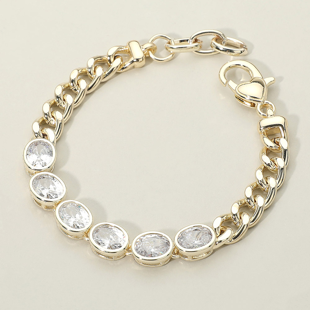 Details • Size : 0.3" H, 7" + 1" L • Lobster Clasp Closure • Elegant station chain bracelet featuring oval crystal accents spaced along a sleek link design. This refined bracelet adds subtle sparkle and balance, making it ideal for everyday styling, gift assortments, and trend-forward jewelry collections seeking timeless appeal. • Gold Dipped • CZ Cubic Zirconia